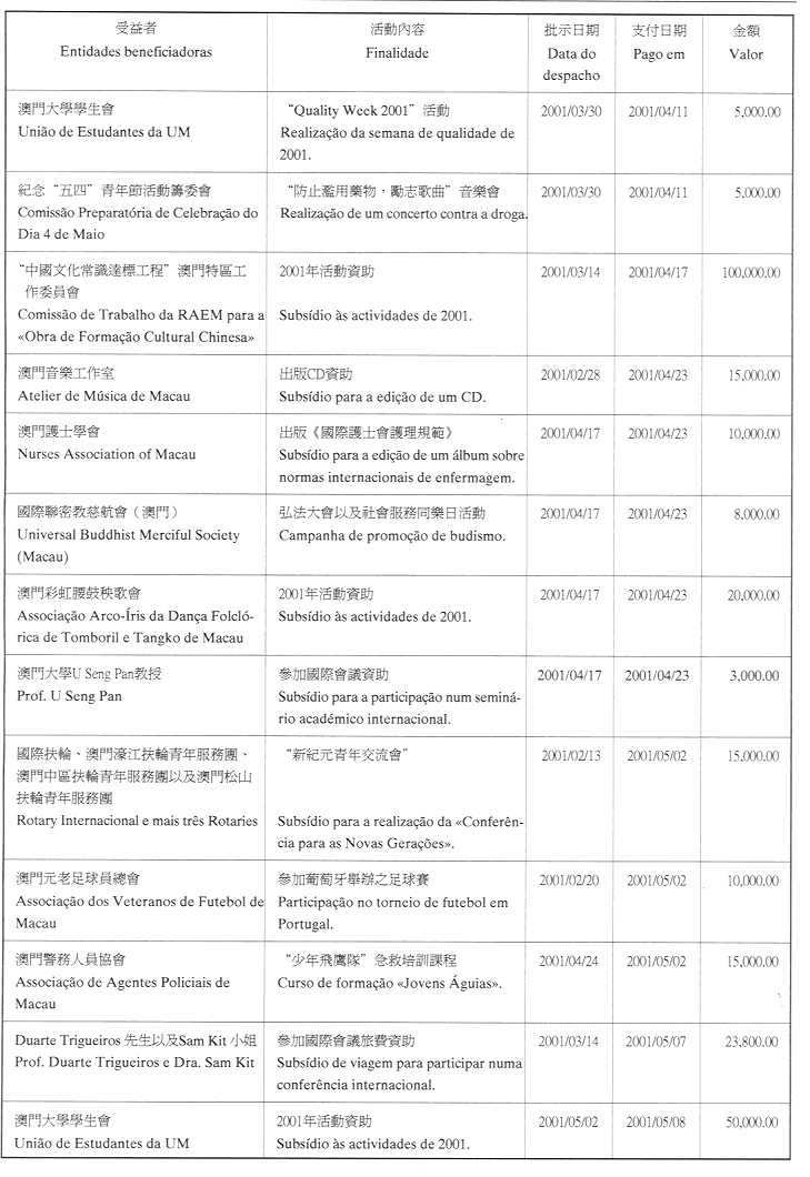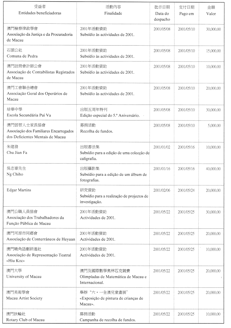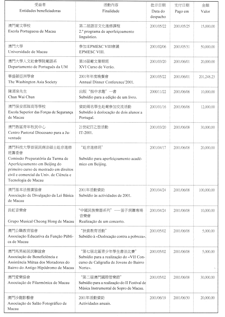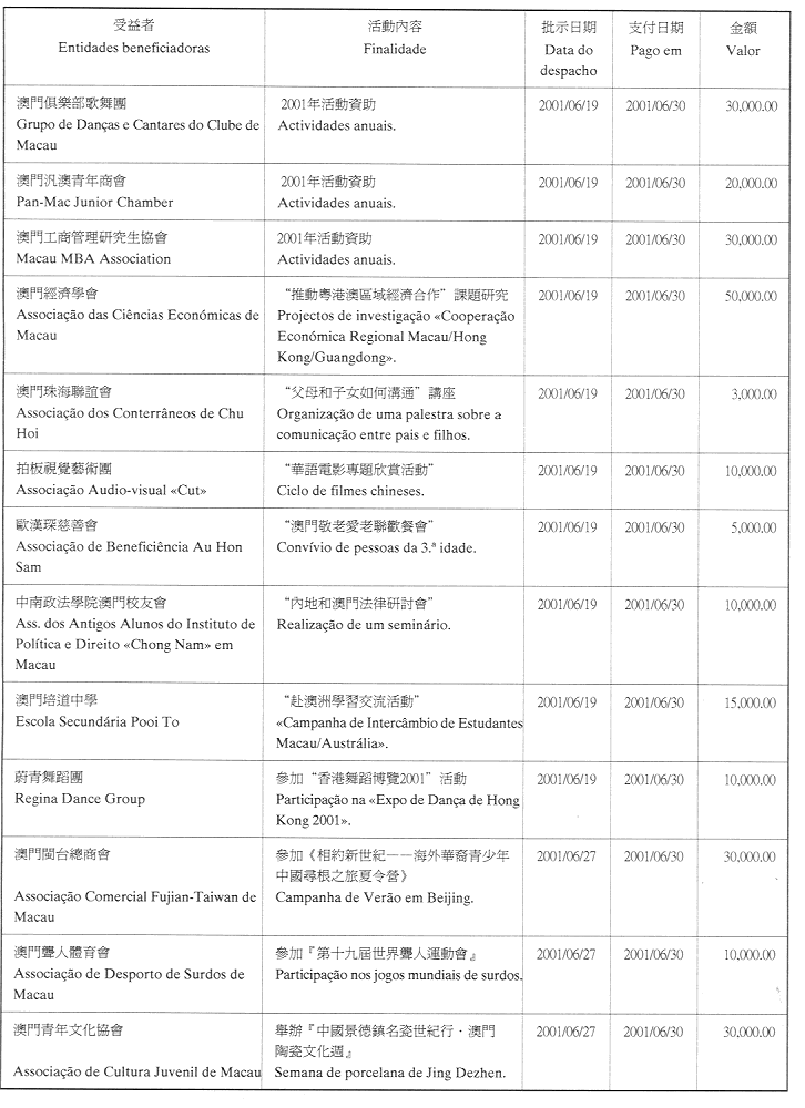 根據八月二十六日第54/GM/97號批示關於撥給私人和私人機構財政資助的有關規定,澳門基金會現公佈二零零一年第二季度的贊助名單: