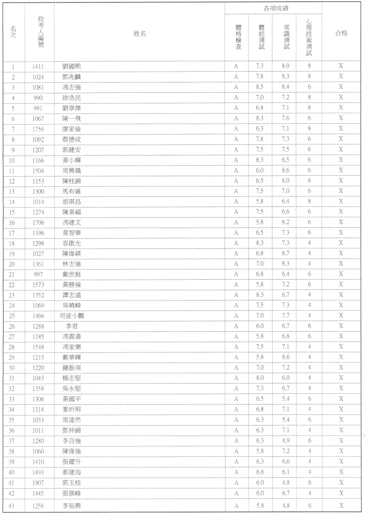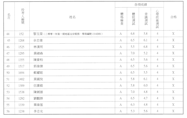 根據十一月十六日第54/98/M號法令核准之《地區治安服務工作管制規則》第八條第四款之規定,並經保安司司長於二零零一年十月四日之批示確認,現公佈地區招聘體格檢驗委員會執行之“二零零一年度第二期地區治安服務男性普通訓練班”投考人體格檢查成績名單。
