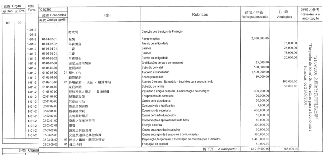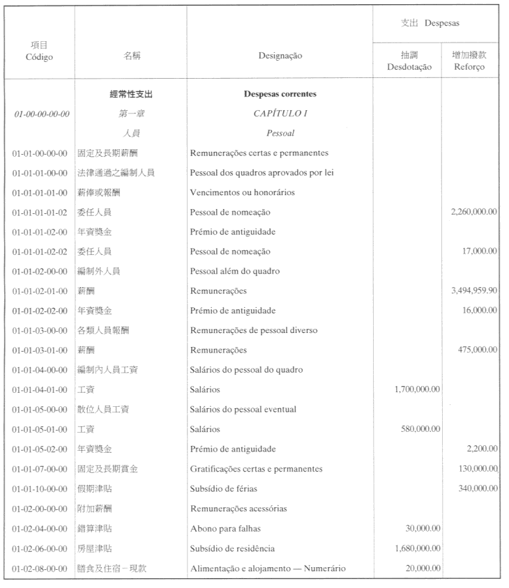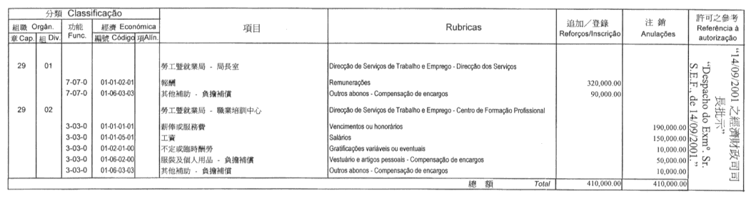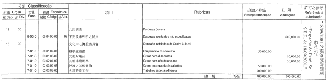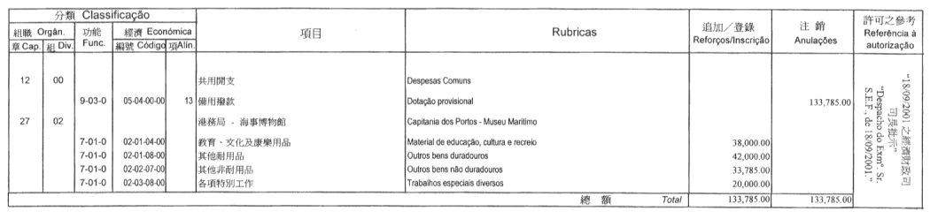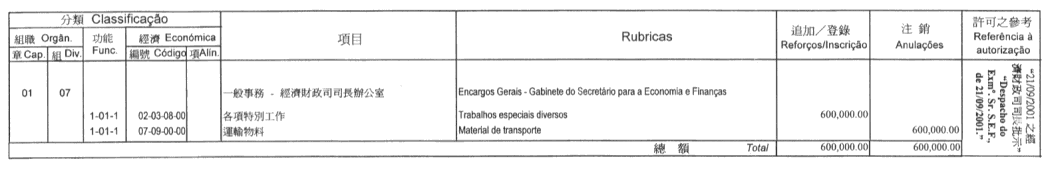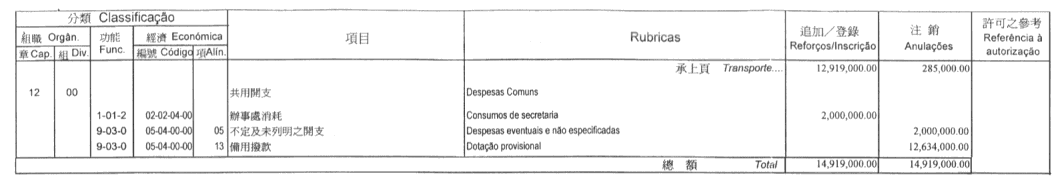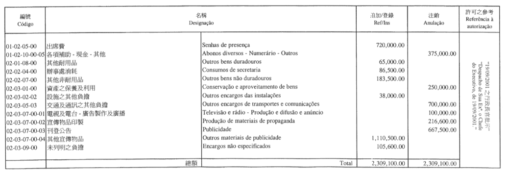 根據刊登於《澳門特別行政區公報》第五十二期(副刊)的十二月十三日第13/2000號法律第十二條規定,對本經濟年度澳門特別行政區財政預算第十二章開支功能分類9-03-0經濟分類05-04-00-00-18,項目為“ 其他經常開支——雜項——立法會選舉執行開支 ”的整體款項的分配,作出經四月二十七日第22/87/M號法令修訂的十一月二十一日第41/83/M 號法令第二十一條第三項規定所核准的修改,茲公布如下: