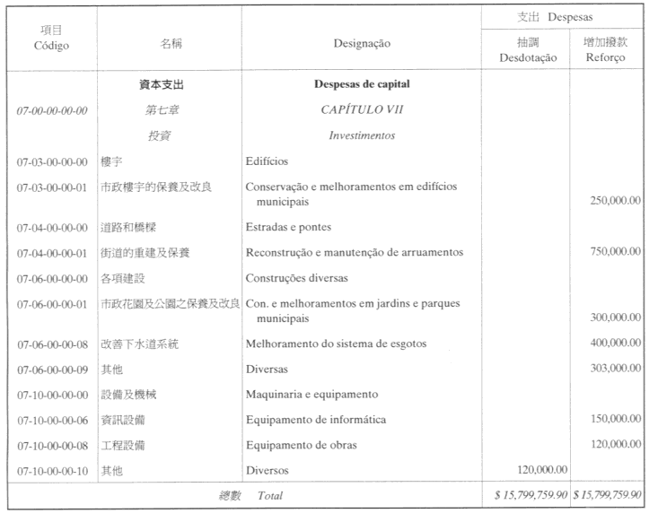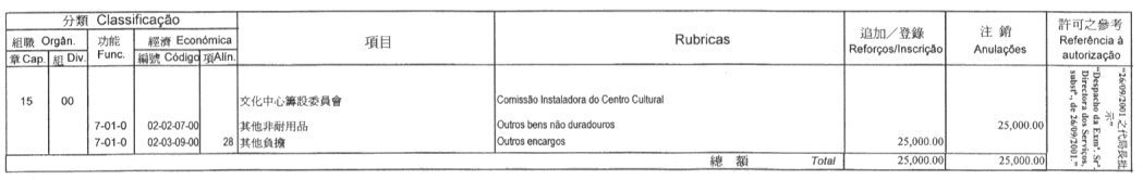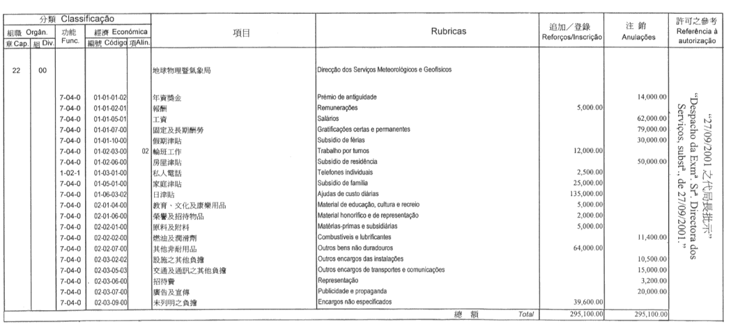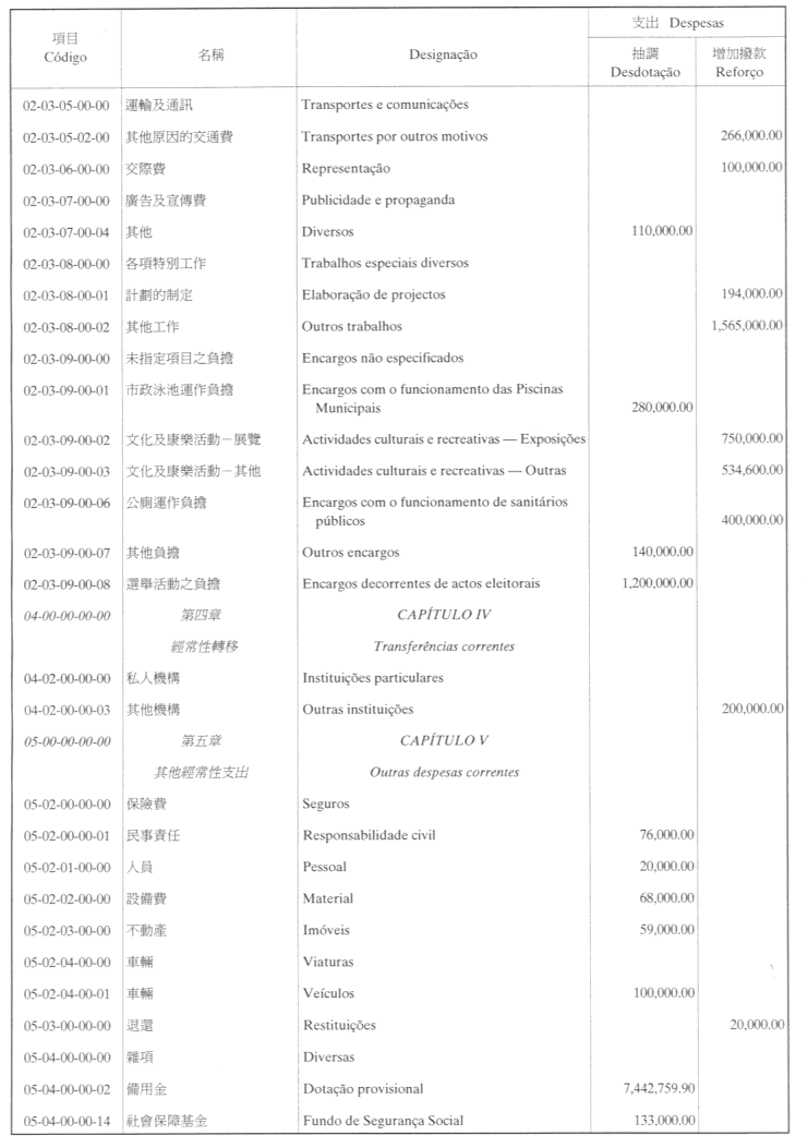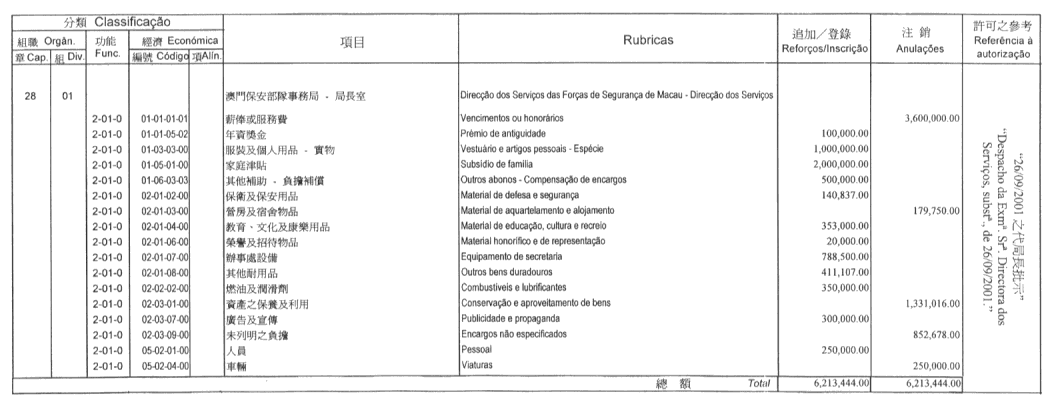 茲聲明根據十二月二十七日第11/93/M號法律第二十一條第一、第二及第四款和第二十二條第二款a)項及b)項之規定及按照二零零一年九月二十五日市議會決議,三月十三日第59/2001號行政長官批示所核准之臨時澳門市政局本身預算之支出表修改如下: