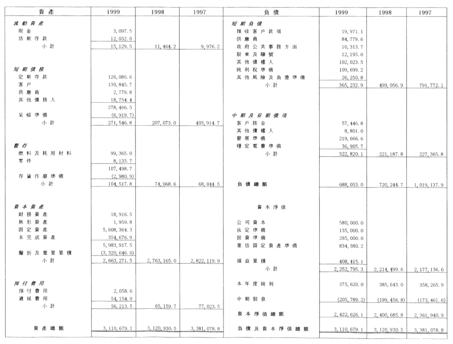 本行認為上述之財務報表均真實與公平地反映貴公司於一九九九年十二月三十一日之財政狀況及貴公司截至該日止年度之業績和現金流量,並已按照刊載於財務報表附註二的主要會計政策和根據附註一所指有關專營合約的規條而編製。