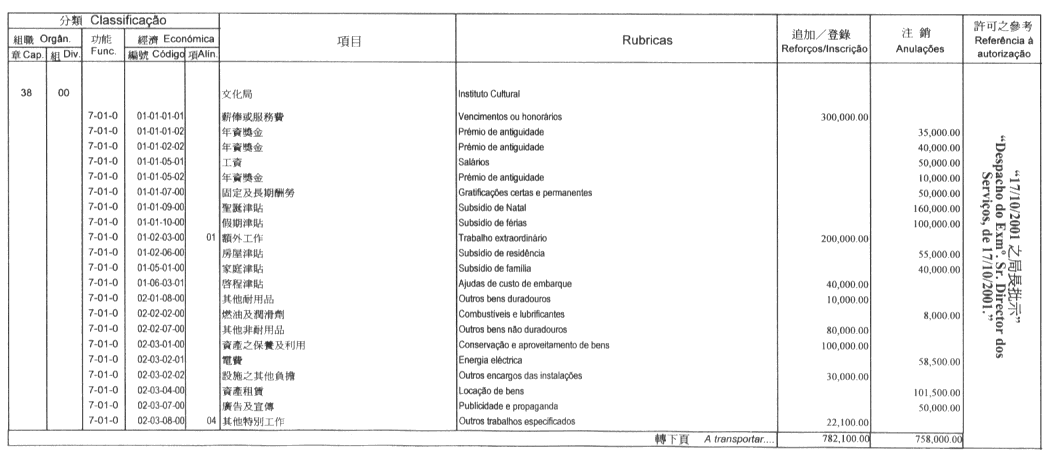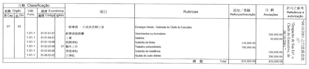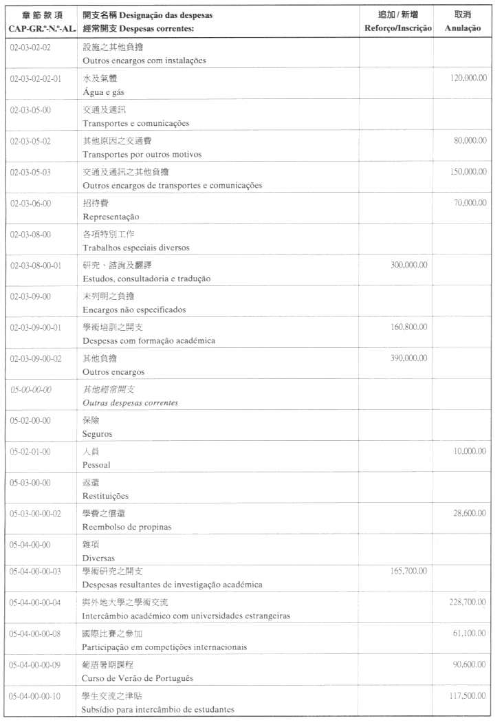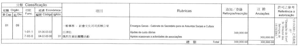 根據九月二十七日第53/93/M號法令第十九條的規定,公佈經由社會文化司司長於二零零一年十月十六日批示所核准的澳門大學二零零一年財政年度本身預算之第二次修改: