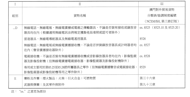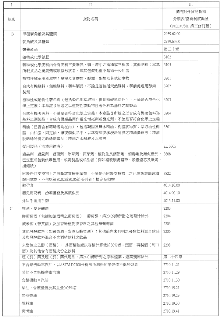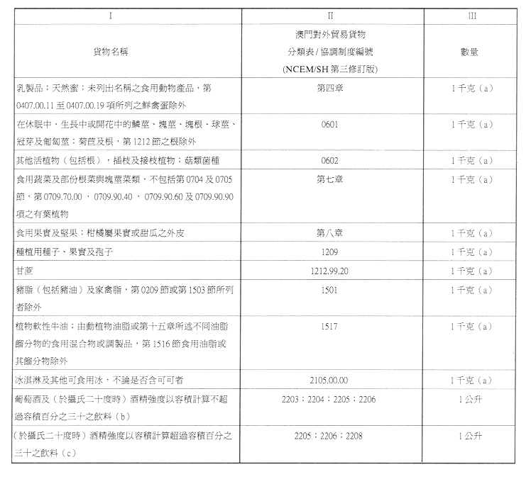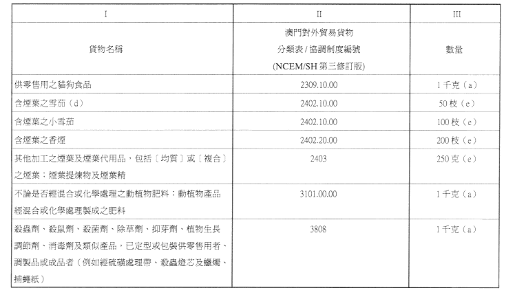 一、本批示附件一之表內第I及II欄列為供個人自用或消費而進口之貨物,祇要係由自然人手提或裝於隨身行李,以及不超過同表第III欄所指每人可攜帶數量,則該等貨物之進口不列入經十二月二十一日第59/98/M號法令修改之十二月十八日第66/95/M號法令第一條第二款c項和d項之範圍。
