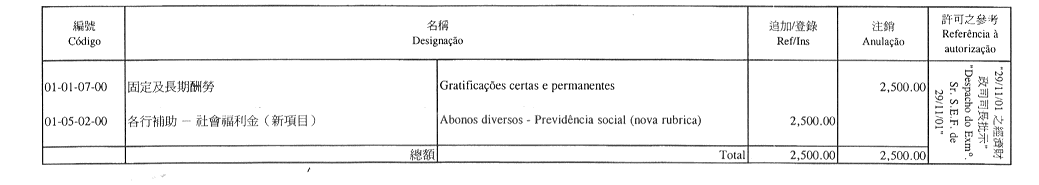 Nuno Manuel Figueira Cordeiro,為第一職階一等文員——根據十二月二十一日第86/89/M號法令第十一條第一款、第二款及第五款,聯同十二月二十八日第62/98/M號法令修訂之十二月二十一日第87/89/M號法令核准之《澳門公共行政工作人員通則》第二十七條及第二十八條、以及十月十一日第57/99/M號法令核准之《行政程序法典》第一百一十八條第二款a)項之規定,以附註形式修改其散位合同第三條款,轉為擔任工商業發展基金第二職階一等文員之職務,薪俸點為275,自二零零一年十月十二日起生效。