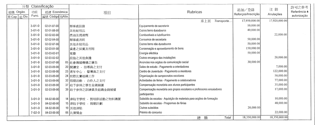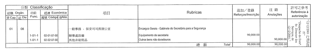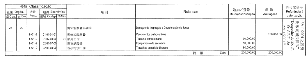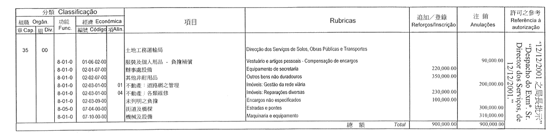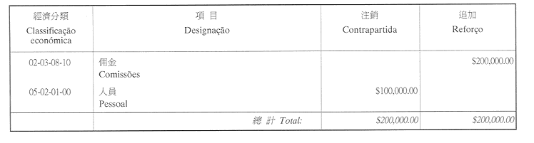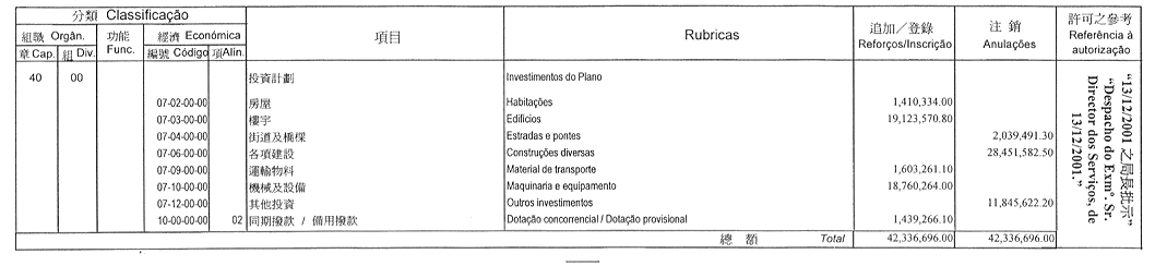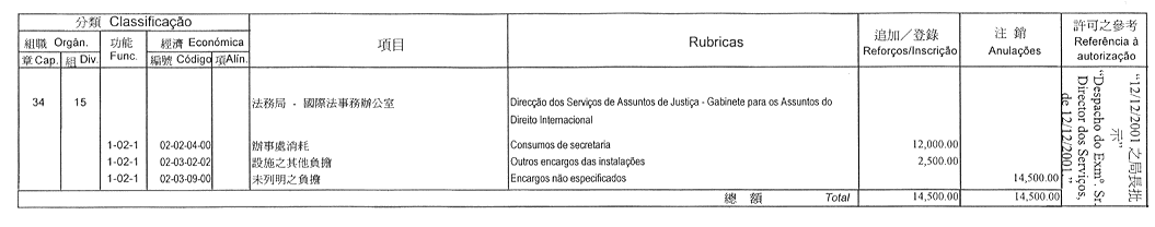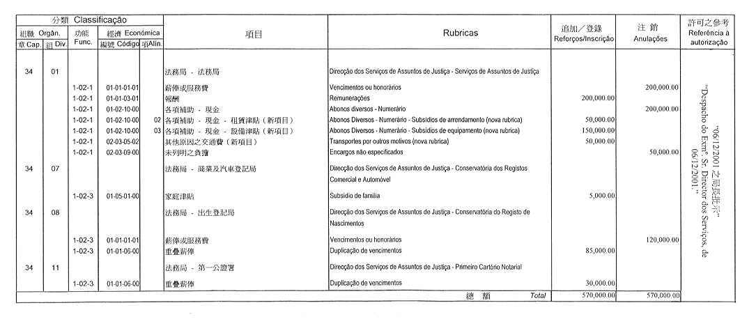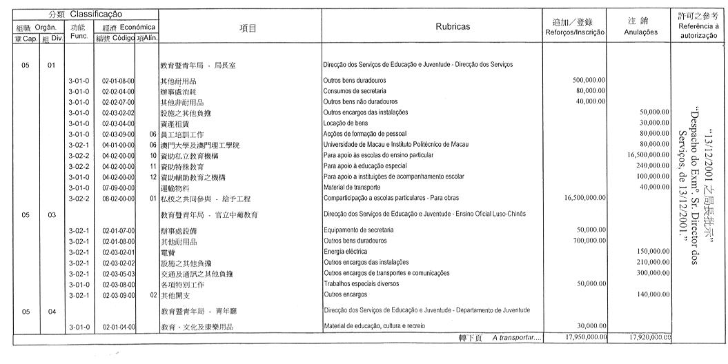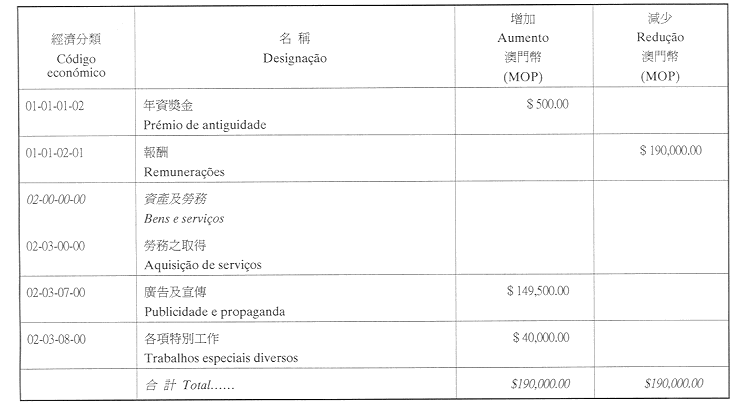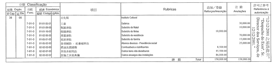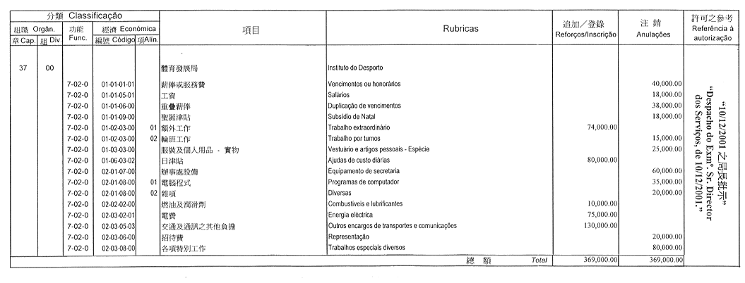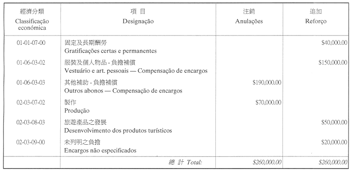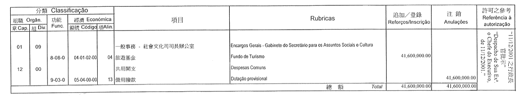 根據九月二十七日第 53/93/M 號法令第十九條規定 ,現刊登有關二零零一年度旅遊基金預算之修改,該修改獲社會文化司司長在二零零一年十二月七日批示核准: