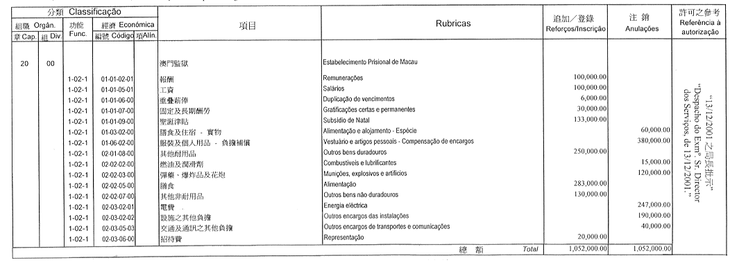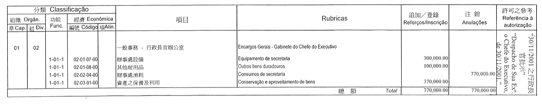 根據一九九三年九月二十七日第53/93/M號法令第十九條規定,茲公佈立法會執行委員會於二零零一年十二月六日議決所批准的立法會二零零一年經濟年度本身預算之修改。