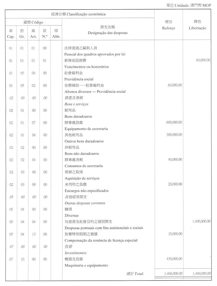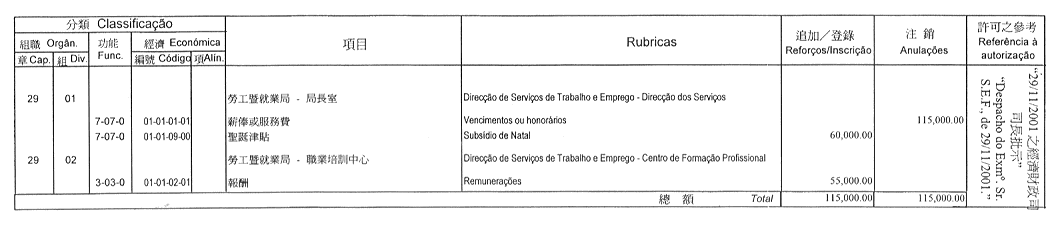 根據九月二十七日第53/93/M號法令第十九條,公布由社會文化司司長於二零零一年十二月十日批准的社會工作局二零零一年度本身預算之第五修改: