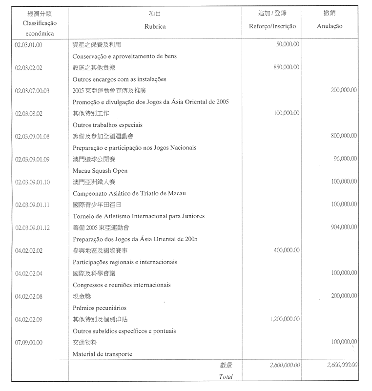 根據九月二十七日第53/93/M號法令第十九條規定,現刊登有關二零零一年度體育發展基金預算之修改,該等修改獲社會文化司司長在二零零一年十一月二十九日批示核准: