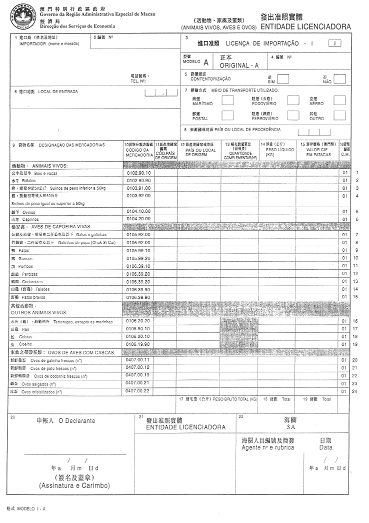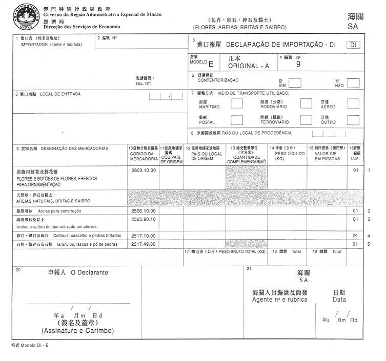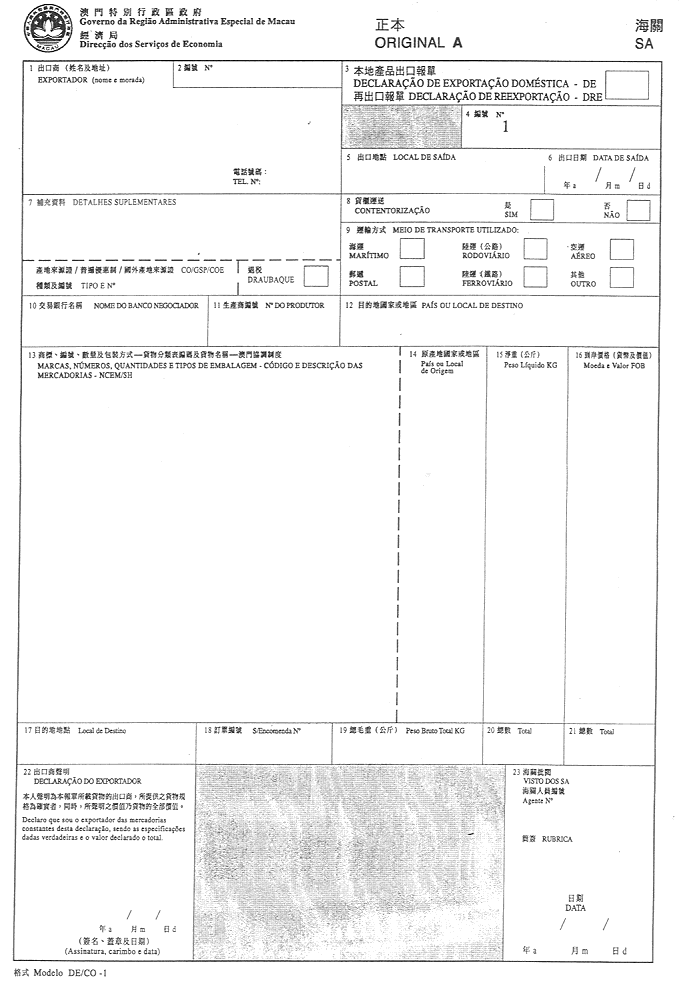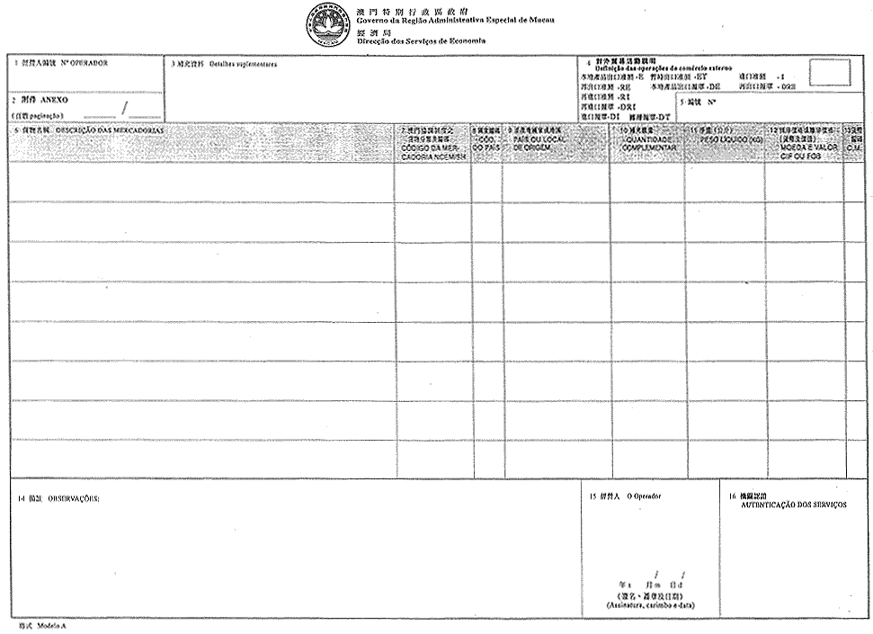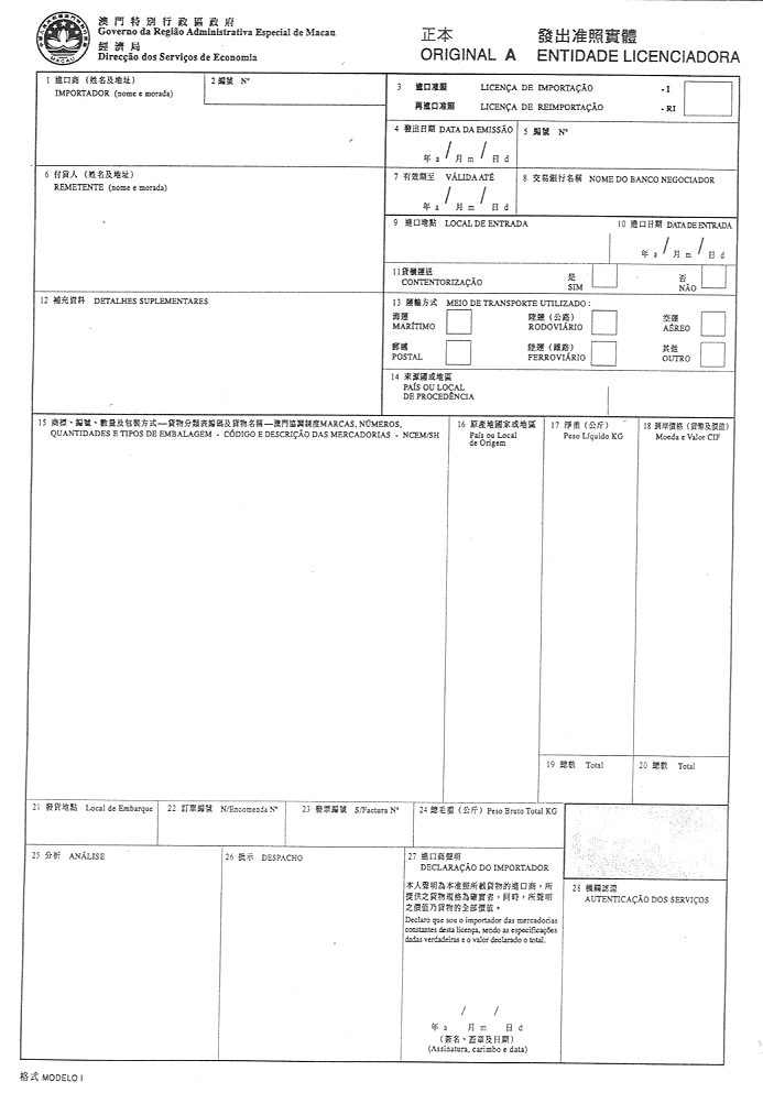 茲根據經十二月二十一日第59/98/M號法令修改之十二月十八日第66/95/M號法令第九條第四款,並結合二月十二日第28/96/M號訓令第二條第四款及第七條第四款之規定,公佈對外貿易活動准照及申報單之印件格式,以及有關之填寫說明。