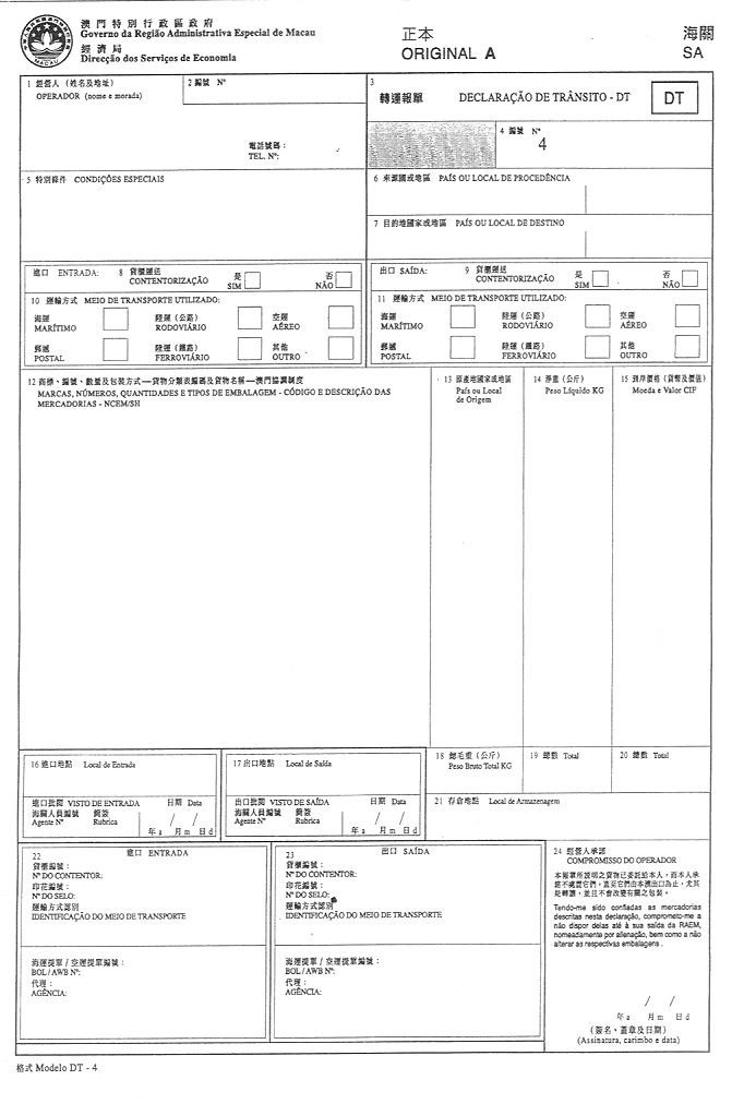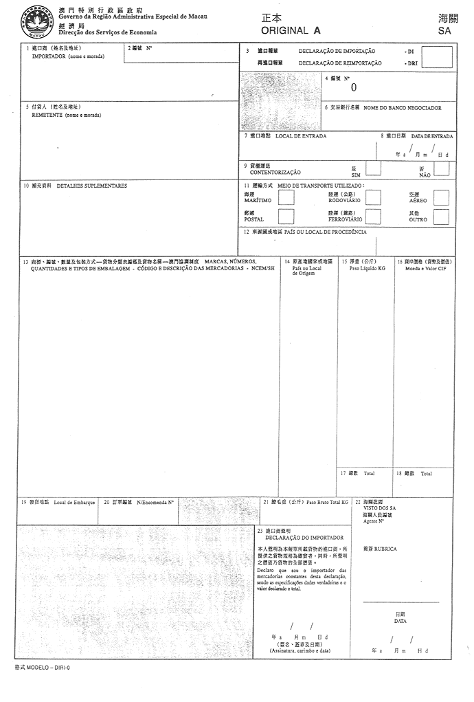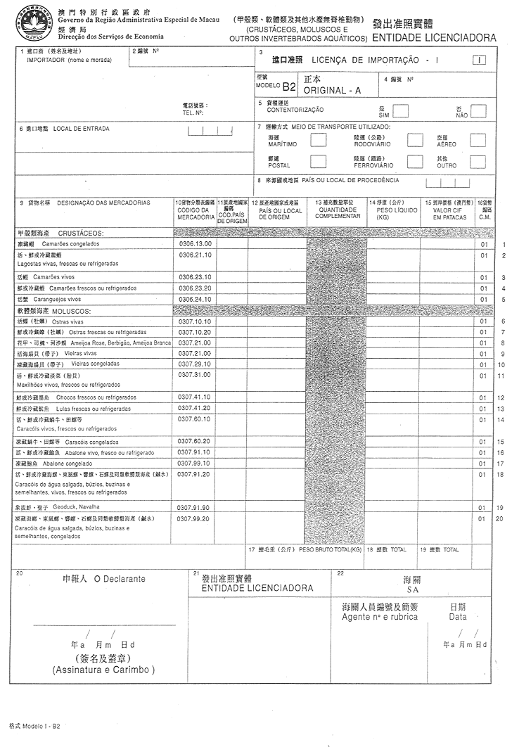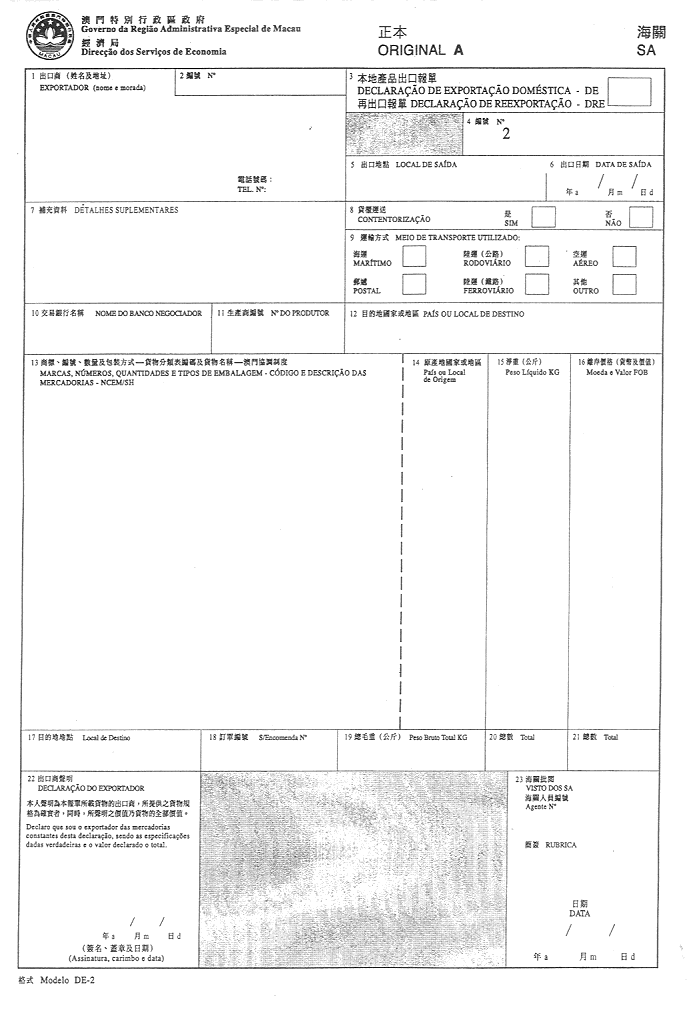 茲根據經十二月二十一日第59/98/M號法令修改之十二月十八日第66/95/M號法令第九條第四款,並結合二月十二日第28/96/M號訓令第二條第四款及第七條第四款之規定,公佈對外貿易活動准照及申報單之印件格式,以及有關之填寫說明。