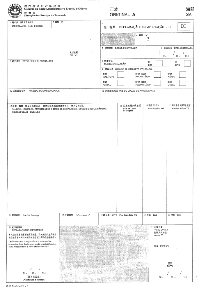 在處理一項再進口之情況下——適當地在第三欄填寫——必須填寫本地產品出口准照、或暫時出口准照、或出口申報單之編號,而再進口之貨物是根據該准照或申報單出口的。