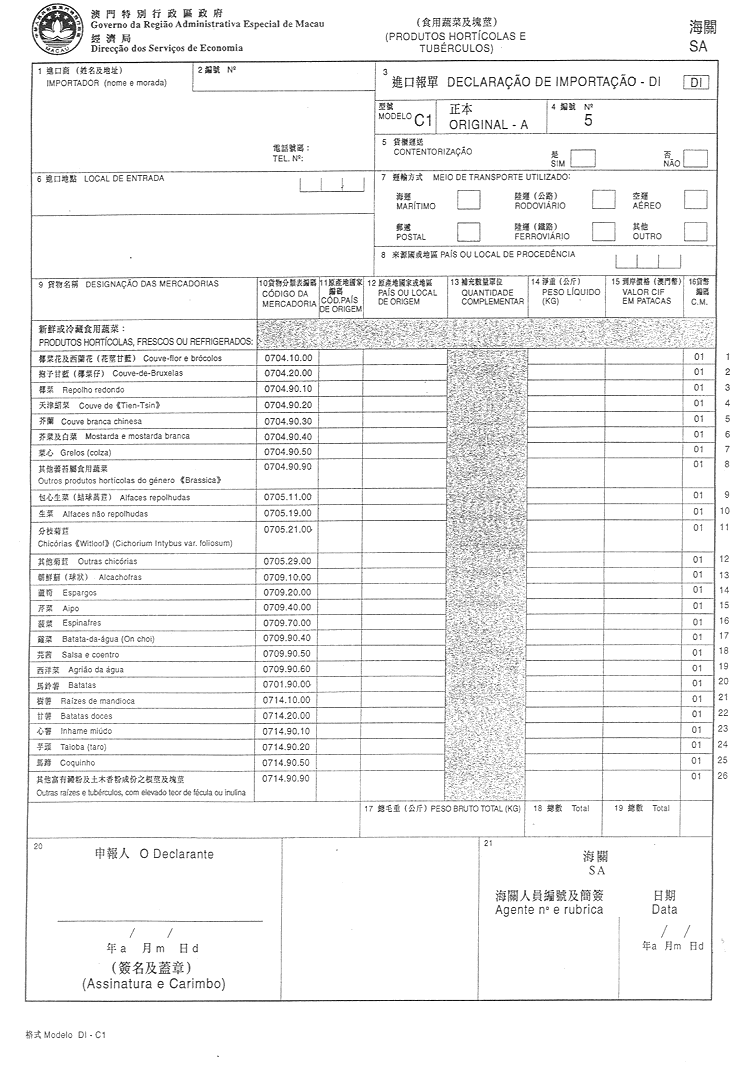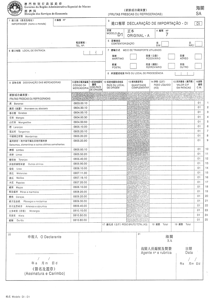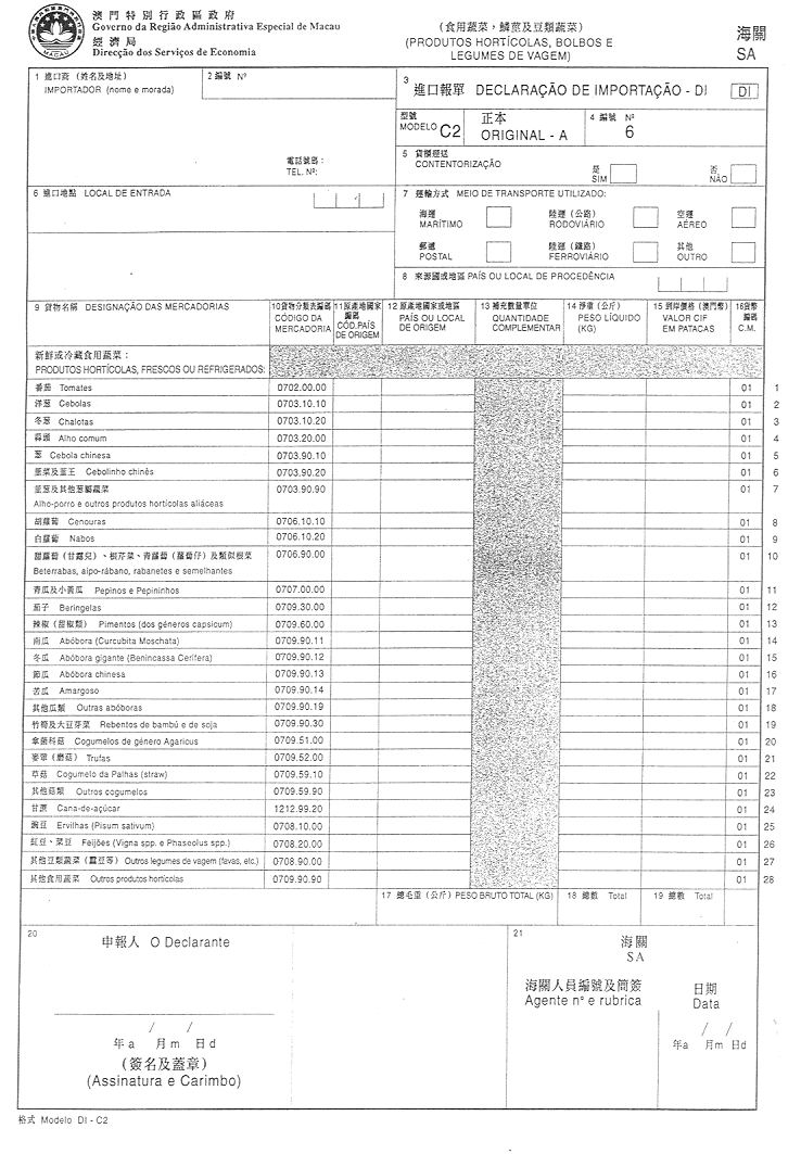第十五欄——商標、編號、數量及包裝方式——貨物分類表 編碼及貨物名稱——澳門協調制度