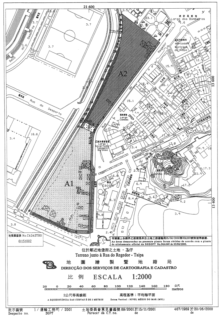 a) 修改一幅以租賃及免除公開競投制度批出、位於氹仔地堡街附近、面積16,838平方米的土地的批給。該土地標示於物業登記局B冊第22969號、以乙方名義登錄於F冊第17283號、並在地圖繪製暨地籍局於2000年6月30日發出的第467/1989號地籍圖中分別以字母“A1”、“A2”及“B”標示。上指地籍圖附於本合同並作為其組成部分;