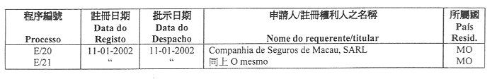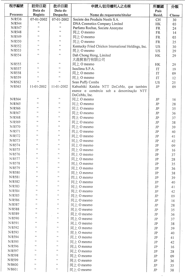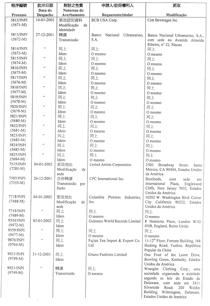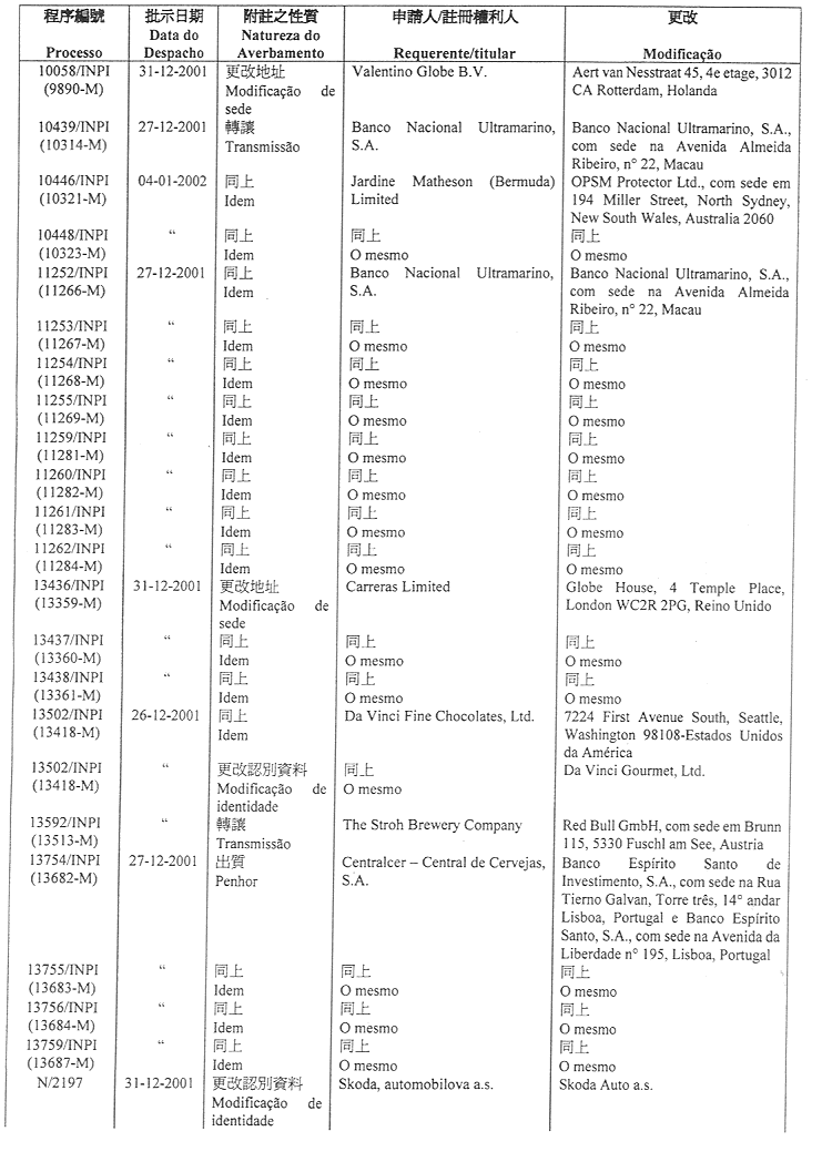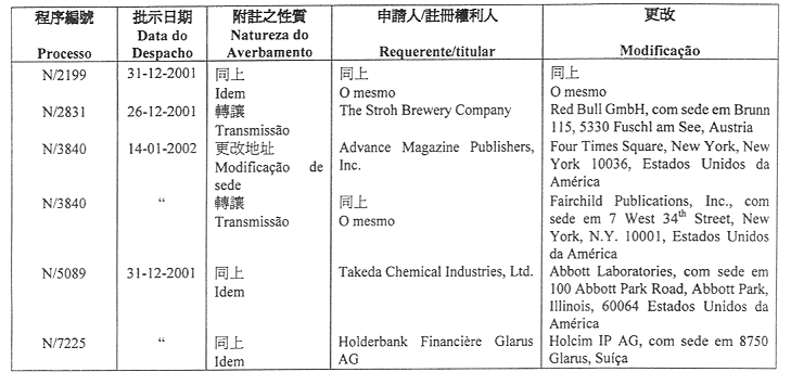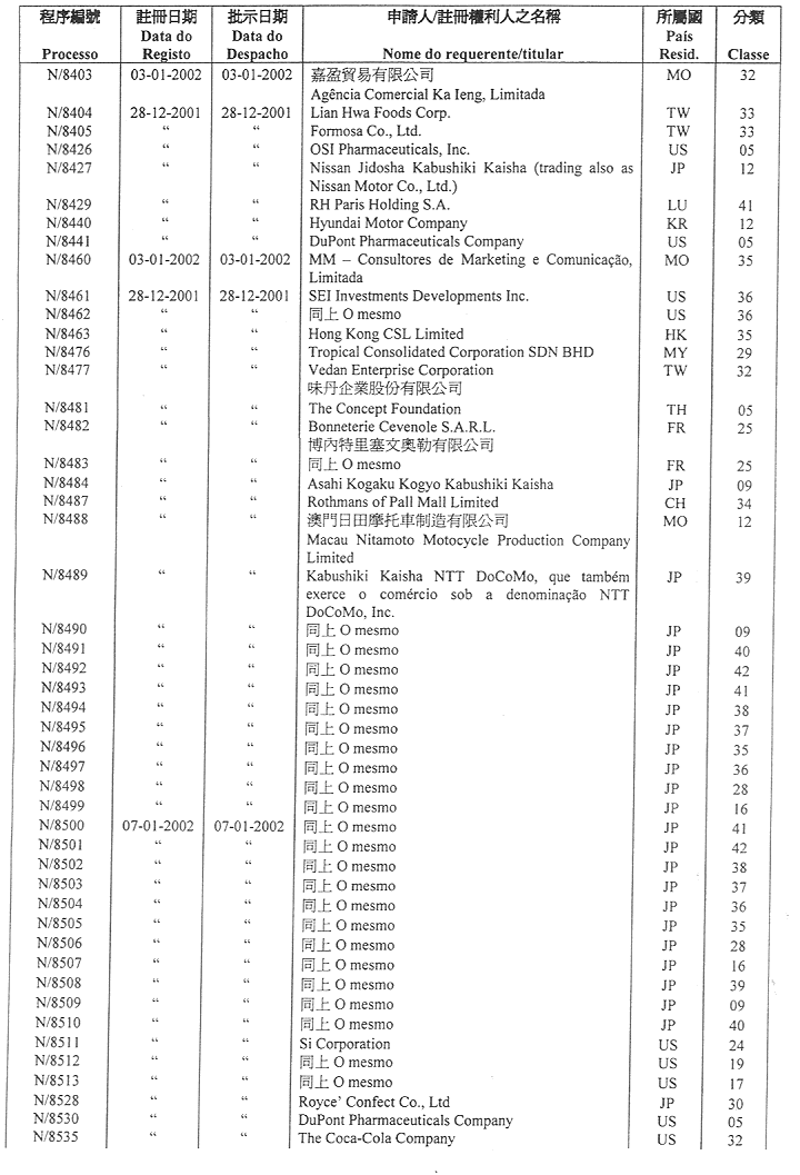 商標編號 10380-M (10490/INPI),10381-M(10491/INPI), 10382-M(10492/INPI),10383-M(10493/INPI),10384-M (10494/INPI),10385-M(10495/INPI)及 10386-M(10496/INPI)-批示日期應改為:“20-12-94”;