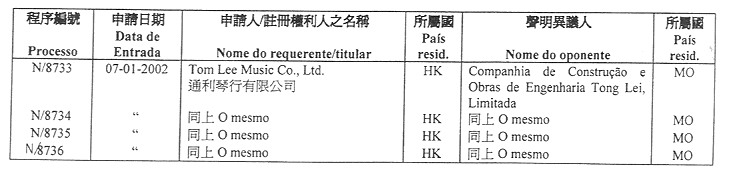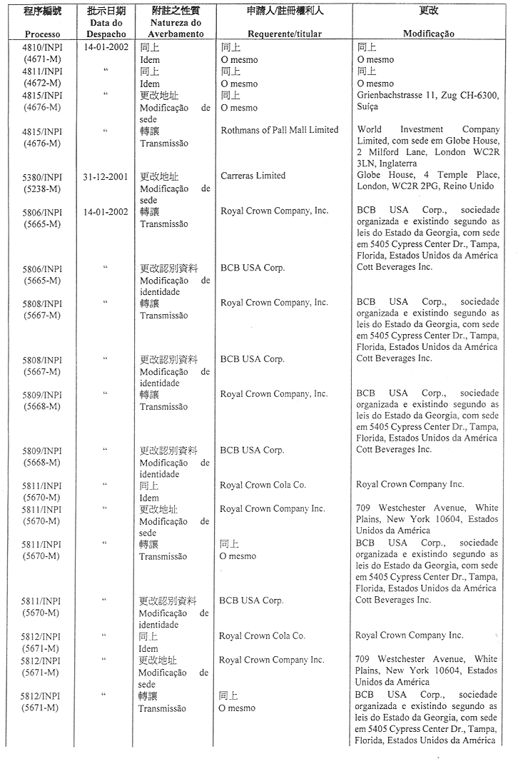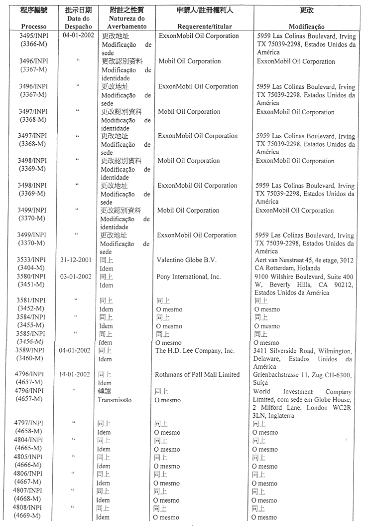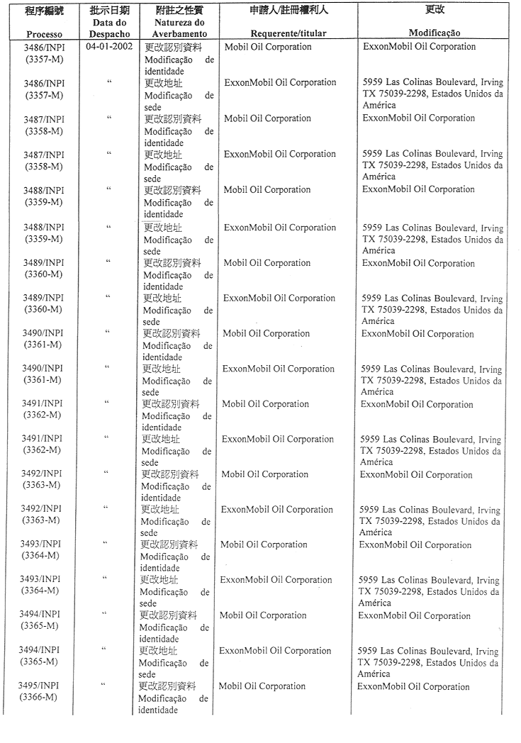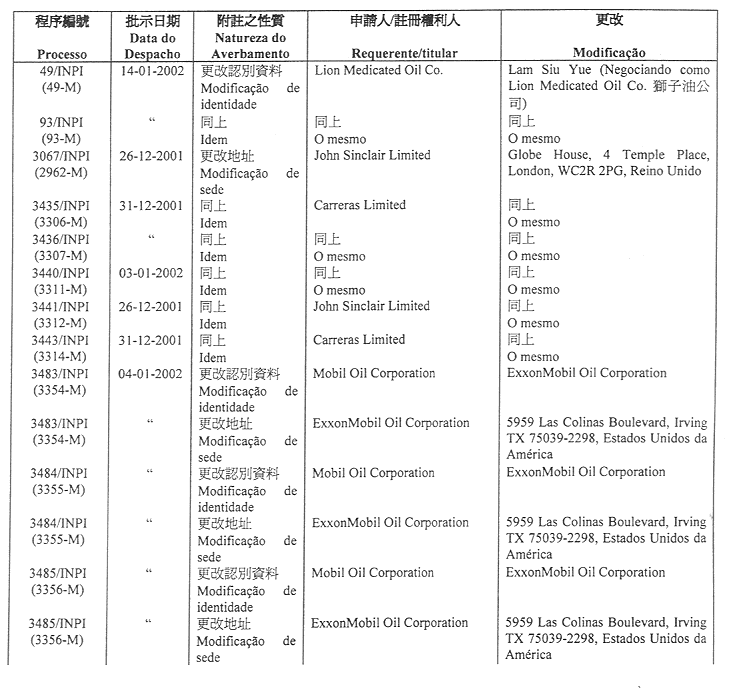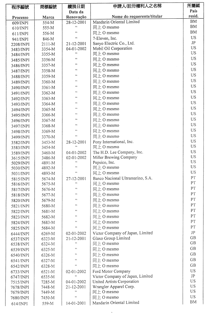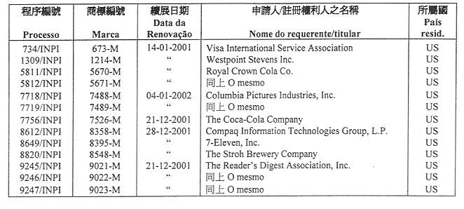 商標編號5251-M(5393/INPI),5253-M(5395/INPI),5255-M(5397/INPI),5256-M(5398/INPI)及5260-M(5402/INPI)-在續展表,(申請人/註冊權利人之名稱)欄目內,原文為:“同上”;