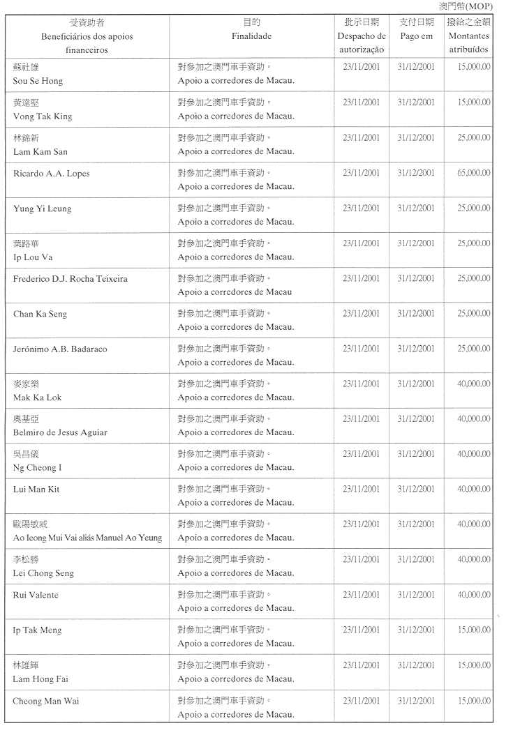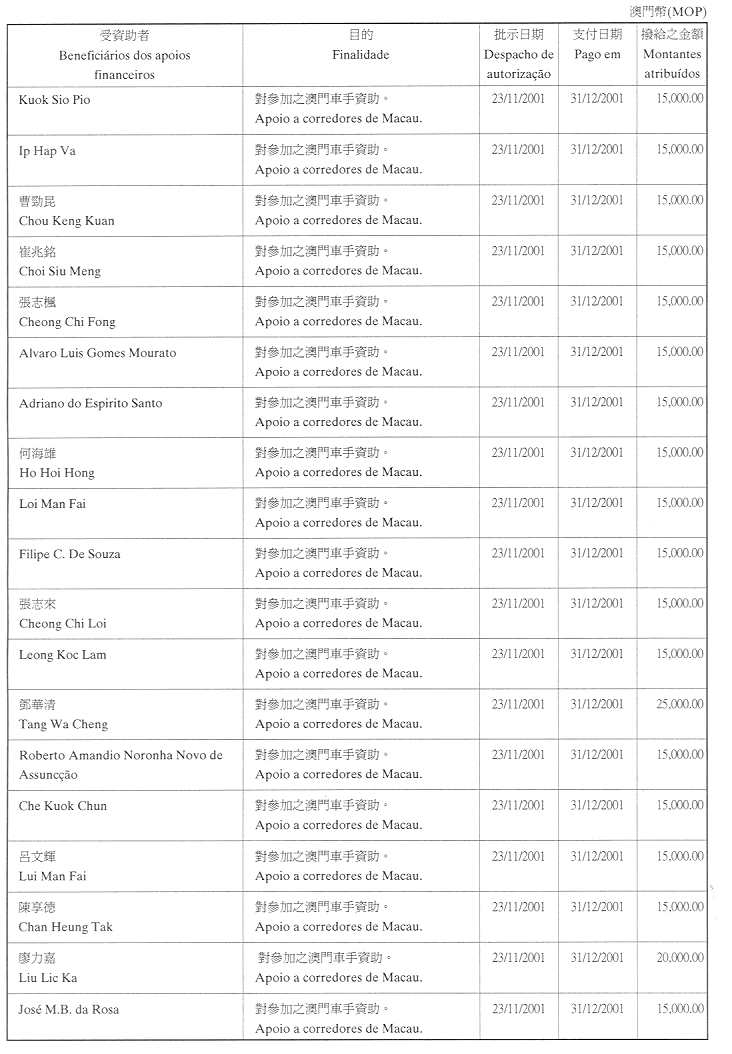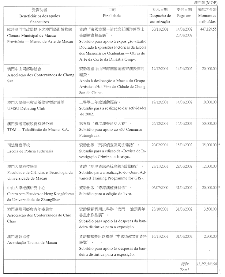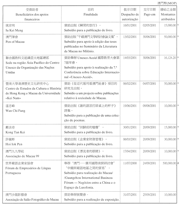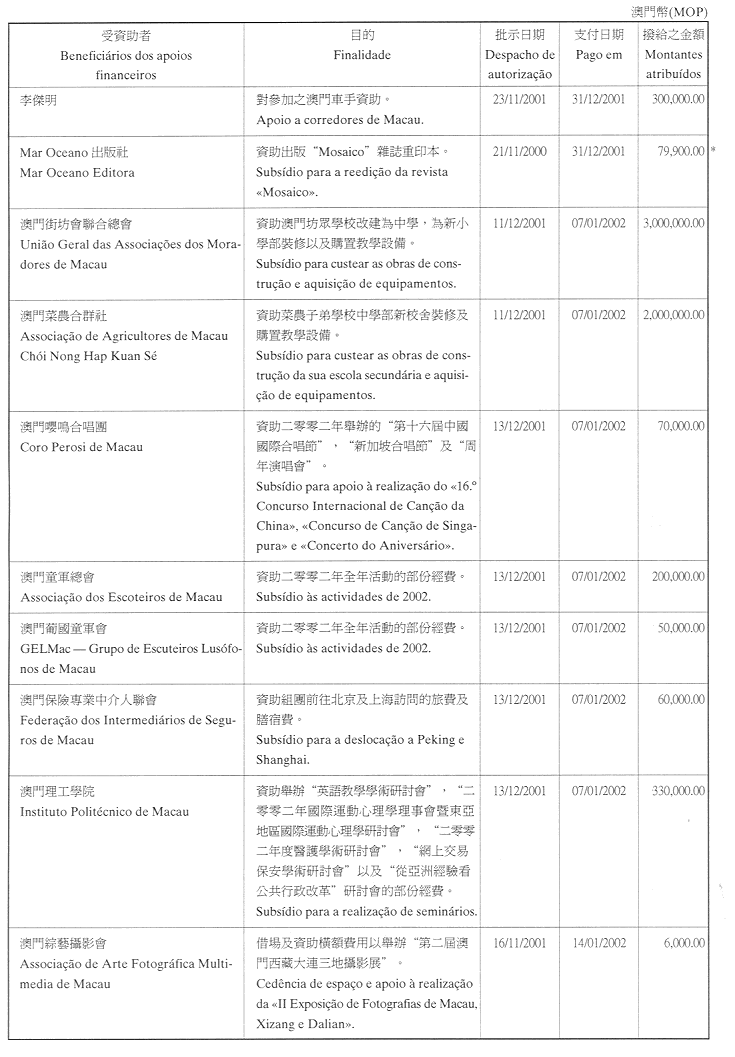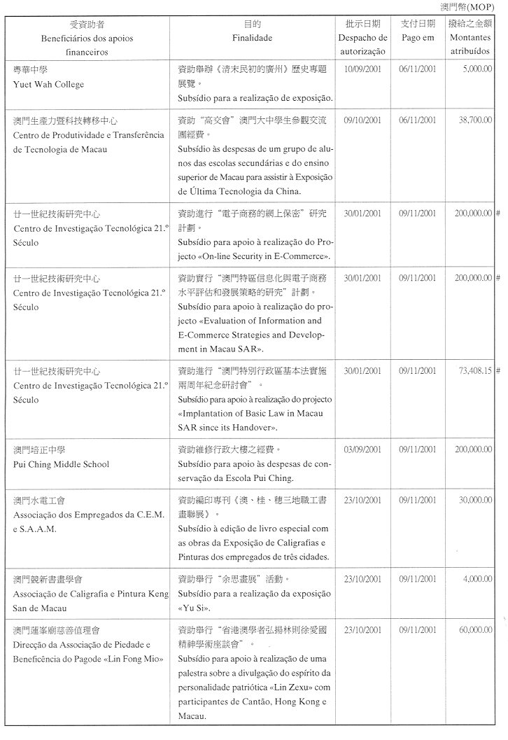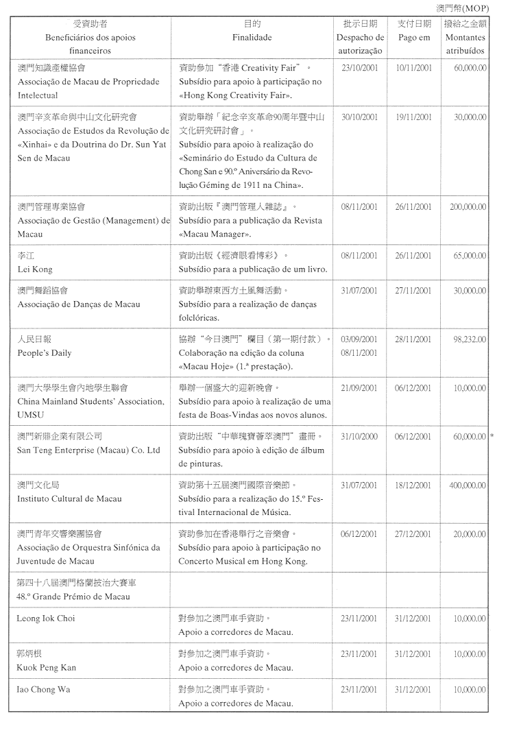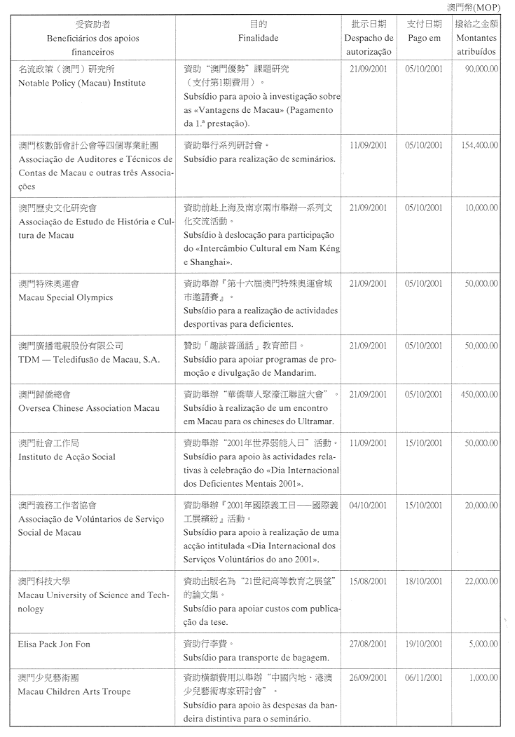 根據八月二十六日第54/GM/97號批示關於撥給私人和私人機構財政資助的有關規定,澳門基金會現公佈二零零一年第三及第四季度的贊助名單:
