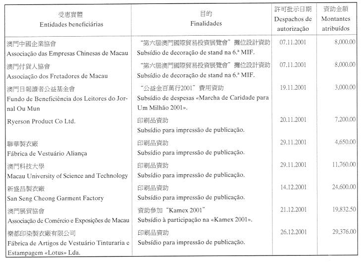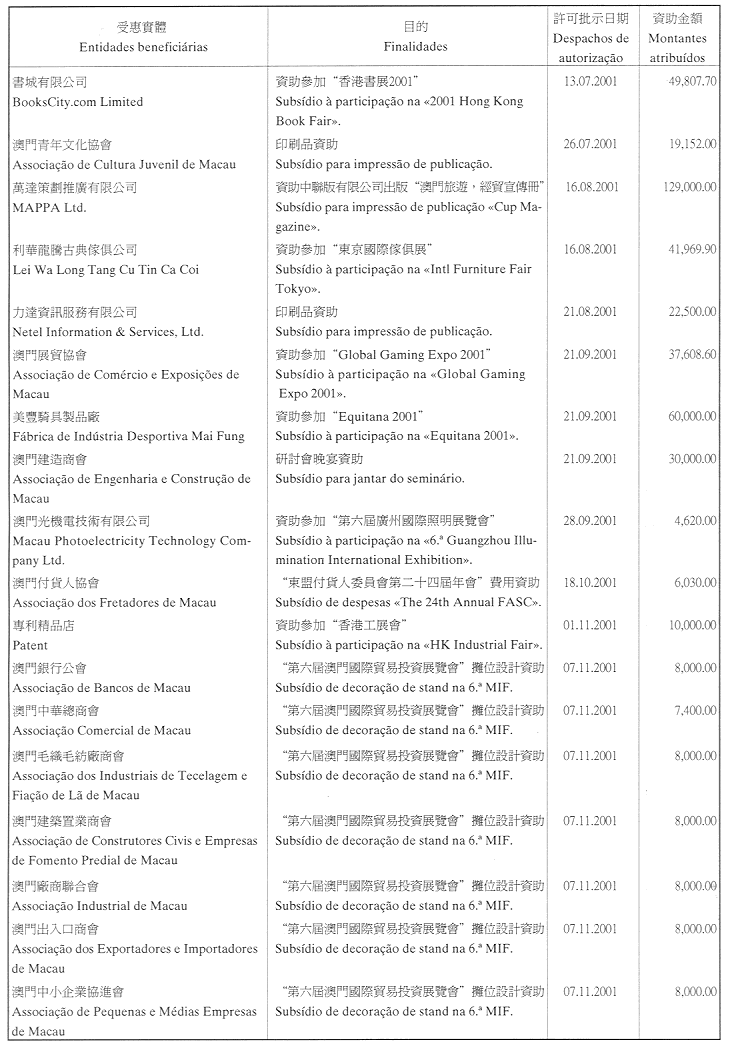 為履行給予私人機構財政資助的八月二十六日第54/GM/97號批示,澳門貿易投資促進局現刊登二零零一年第四季度受資助的名單: