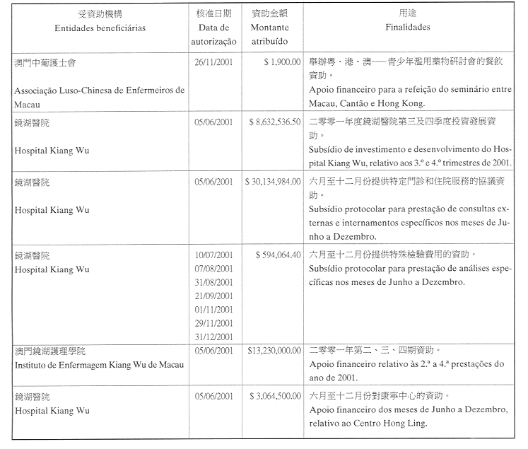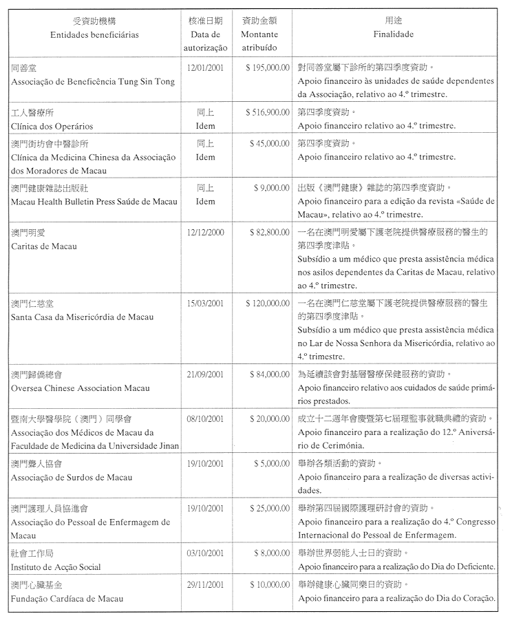 為履行有關給予個人和私立機構財政資助的八月二十六日第54/GM/97號批示,衛生局現公佈二零零一年第四季度獲資助的名單:
