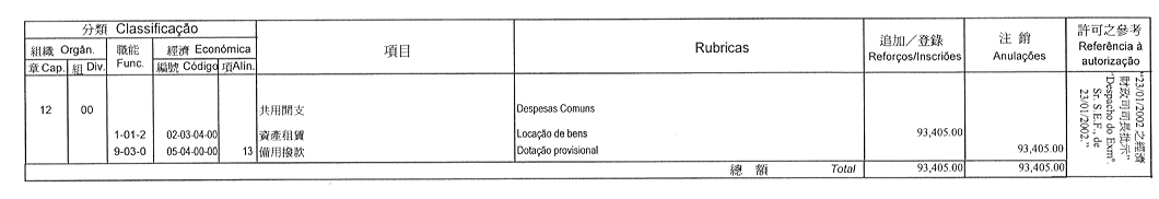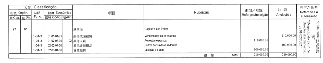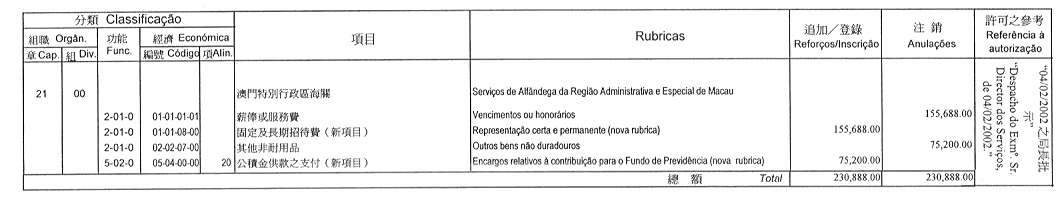 根據四月三十日第17/GM/87號批示,茲公布下列(澳門特別行政區財政預算/二零零二)款項轉帳,該轉帳由經四月二十七日第22/87/M號法令第一條修訂的十一月二十一日第41/83/M號法令第二十一條第三項規定所核准: