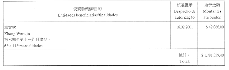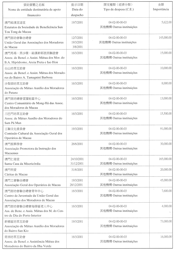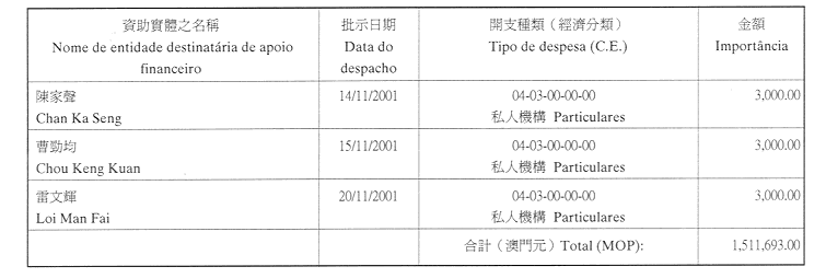 | 澳門大學學生會 | 二零零一年二月一日 | $240,000.00 | 為澳門大學學生會七月至十二月份的日常運作費提供津貼 |