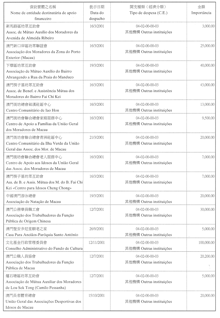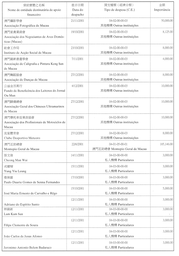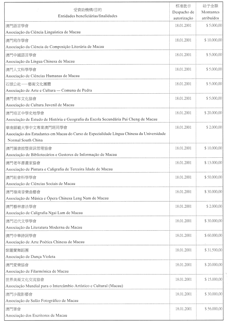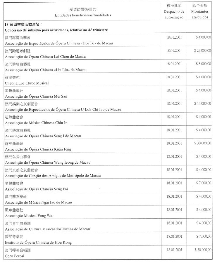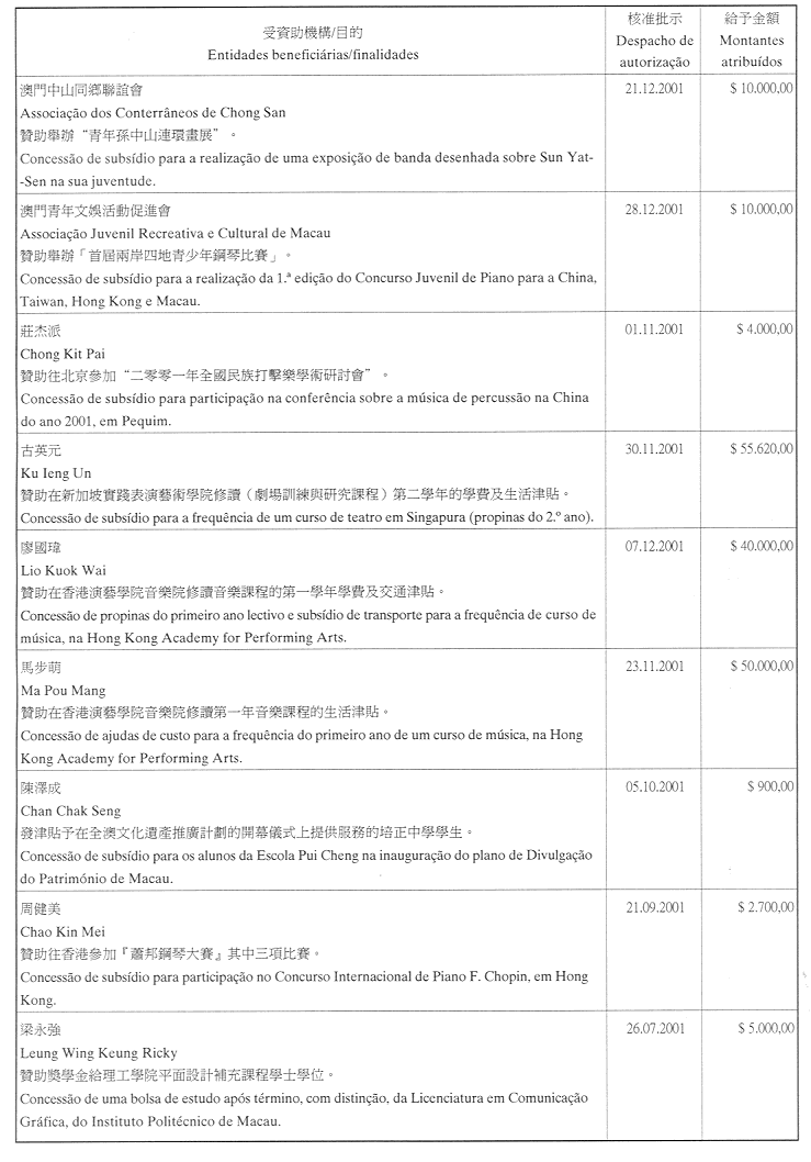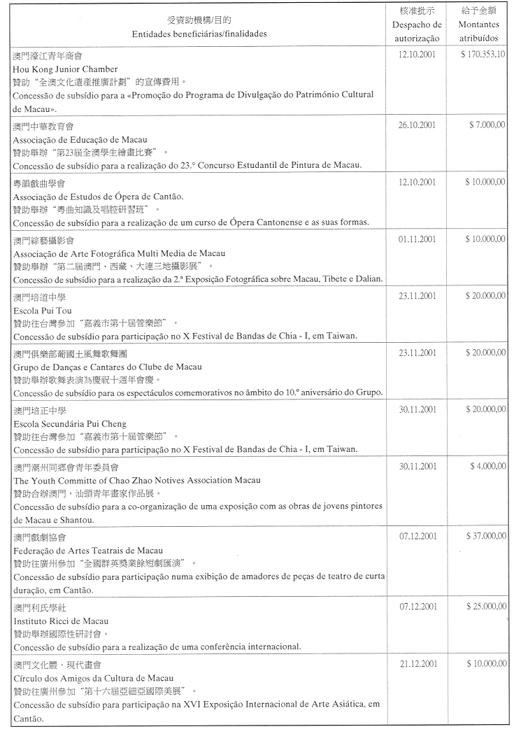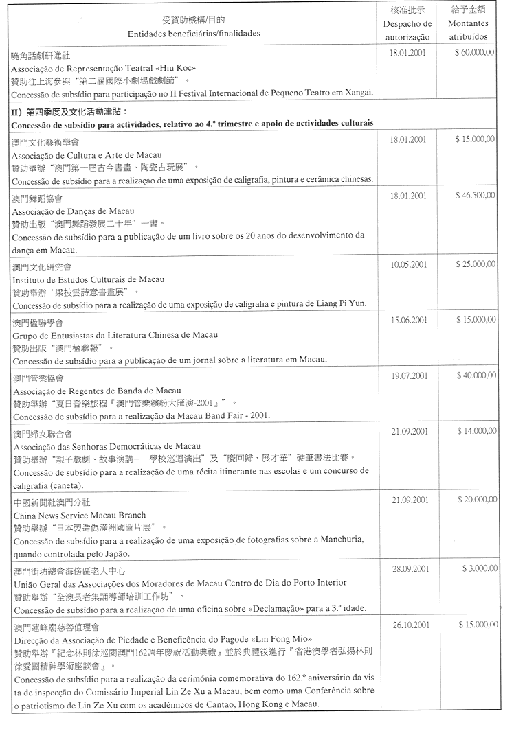 為履行九月一日第54/GM/97號,有關對私人及私立實體提供財政資助的批示,文化基金現公佈二零零一年第四季獲津貼的名單: