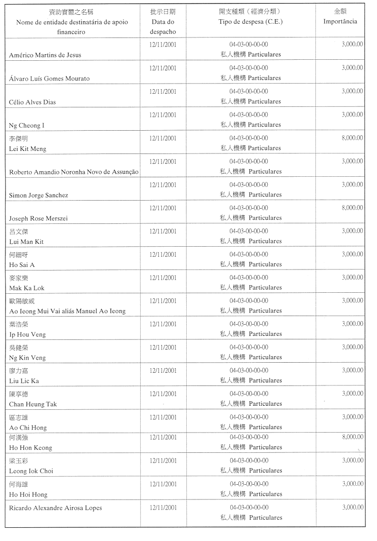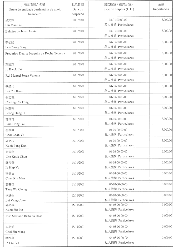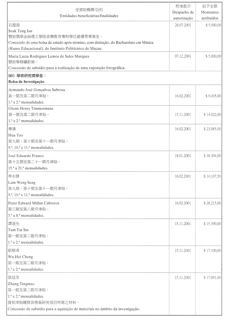 為履行有關給予私人和私人機構財政資助的八月二十六日第54/GM/97號批示,澳門大學現公佈二零零一年第四季度獲資助的名單: