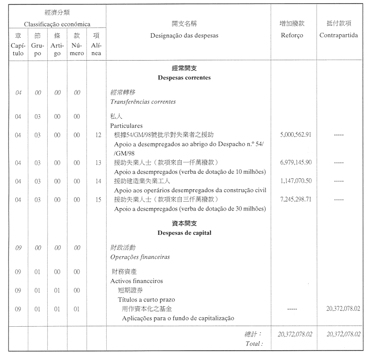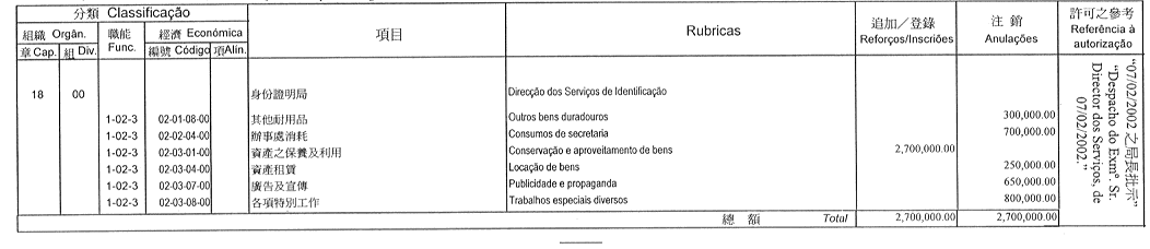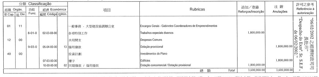 根據四月三十日第17/GM/87號批示,茲公布下列(澳門特別行政區財政預算/二零零二)款項轉帳,該轉帳由經四月二十七日第22/87/M號法令第一條修訂的十一月二十一日第41/83/M號法令第二十一條第三項規定所核准: