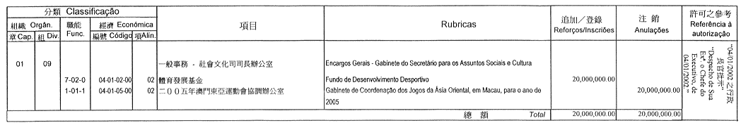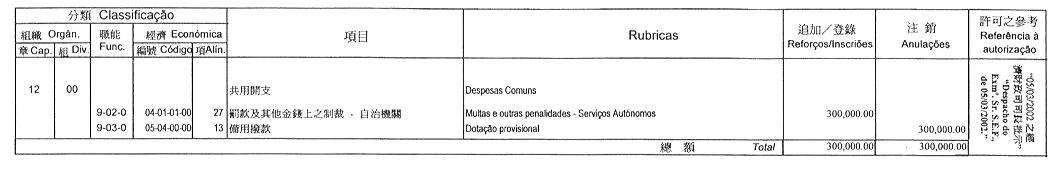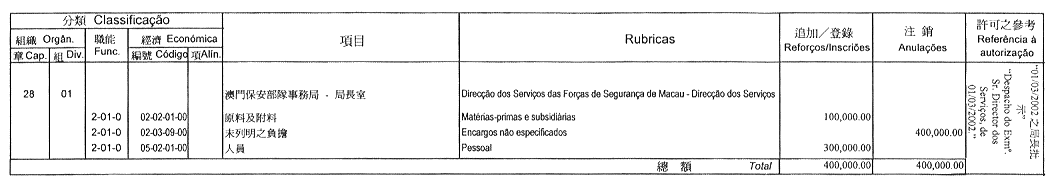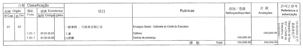 根據四月三十日第17/GM/87號批示,茲公布下列(澳門特別行政區財政預算/二零零二)款項轉帳,該轉帳由經四月二十七日第22/87/M號法令第一條修訂的十一月二十一日第41/83/M號法令第二十一條第三項規定所核准: