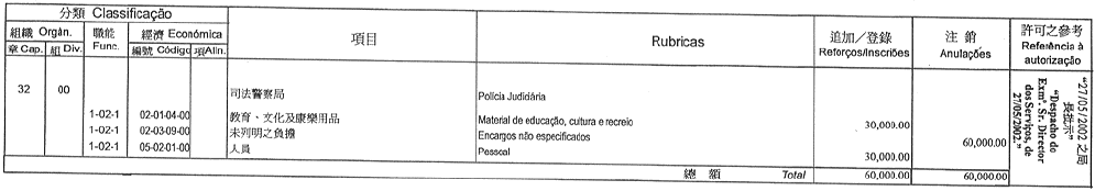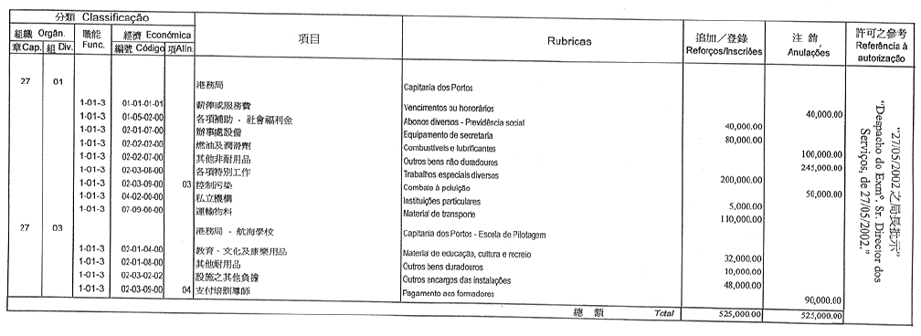 根據四月三十日第17/GM/87號批示,茲公布下列(澳門特別行政區財政預算/二零零二)款項轉帳,該轉帳由經四月二十七日第22/87/M號法令第一條修訂的十一月二十一日第41/83/M號法令第二十一條第三項規定所核准: