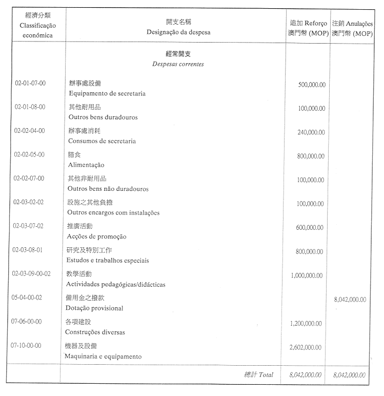 根據九月二十七日第53/93/M號法令第十九條規定,公佈經由社會文化司司長及經濟財政司司長批准之旅遊學院二零零二年度本身預算之第二次修改: