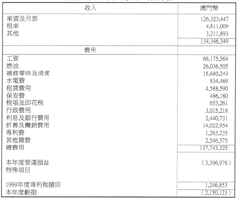 一如過往,本公司的營運線網仍然維持於客流日少的舊城區,未能因城區的遷移而作相應的配合調整。唯二零零一年度的業績得益於澳門整體經濟的改善及成本的嚴格控制。二零零一年虧損對比於二零零零年度虧損減少澳門幣3,304,186。