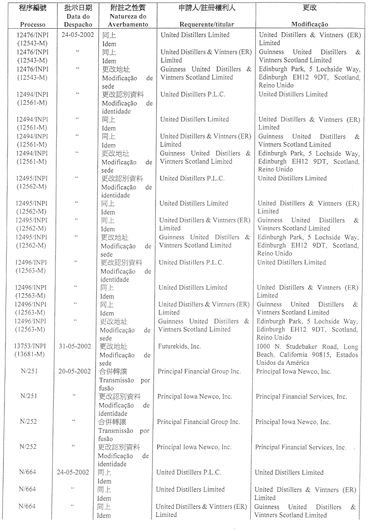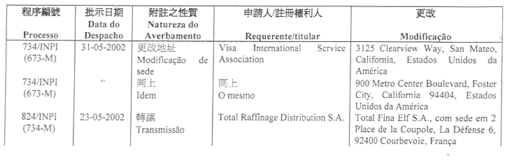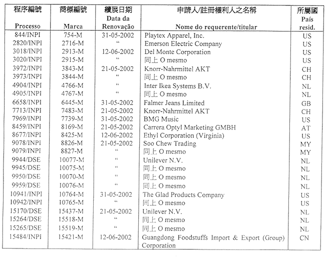 商標編號 N/3801, N/3802 及 N/3803 — 申請人的地址應改為: “De Beukelaer-Pareinlaan 1, B-2200 Herentals, Bélgica”