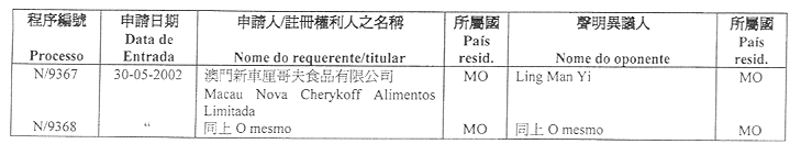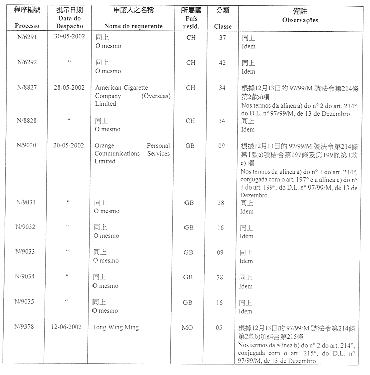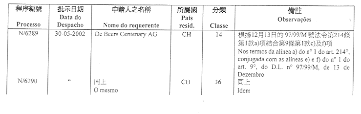 根據十二月十三日第97/99/M號法令第十條及第二百一十條,以下公布本地區商標註冊之請求書,並按照相同法規第二百一十一條第一款,由通告公布日期開始計算兩個月期限內提出聲明異議。