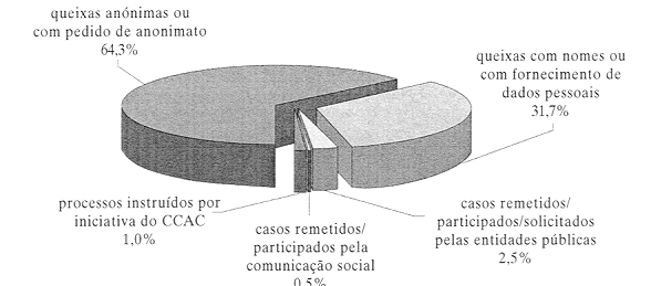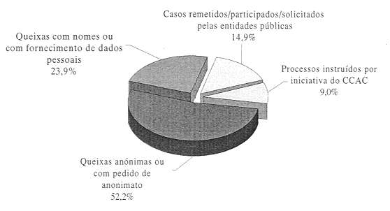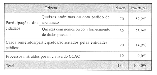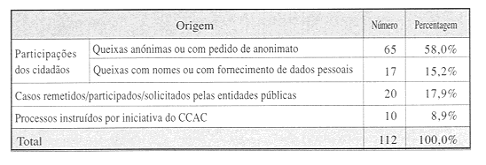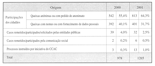 Em 2001, o número total de queixas recebidas foi de 1265, o que representa tanto um aumento de 30% em relação às 978 queixas registados no ano anterior, como um número recorde, desde o ano 1992. De entre essas, 95% reportaram-se a queixas ou denúncias apresentadas pelos cidadãos, facto que revela o crescimento das solicitações da população no que concerne ao combate à corrupção e o aumento da confiança dos cidadãos no CCAC.