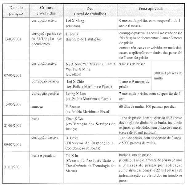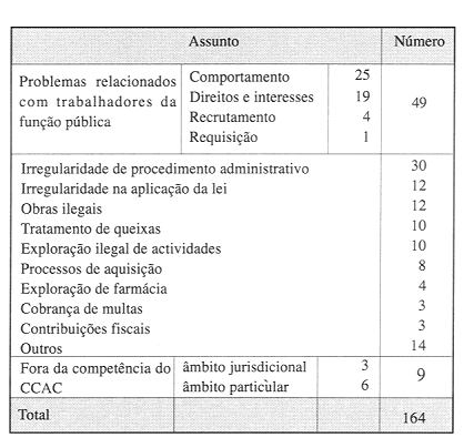 Dos 134 processos instruídos, 112 respeitam a casos criminais e os remanescentes 22 à provedoria de justiça. O CCAC tem vindo a registar, em dois anos consecutivos, um número de processos respeitantes a casos criminais superior ao dos do âmbito de provedoria de justiça. Essa situação ficou a dever-se à adopção de meios informais e, quando entendido conveniente, à remessa de queixas aos serviços competentes na solução da maioria dos casos da área de provedoria de justiça, permitindo, assim, que os problemas em causa sejam solucionados de uma forma atempada, rápida e eficaz. Por outro lado, nos últimos dois anos, o CCAC conseguiu também dar uma resposta rápida às denúncias apresentadas pelos cidadãos e apurar um número significativo de casos de alegada corrupção ou de fraude, o que veio a contribuir para o aumento da confiança da população nesta instituição. Ao mesmo tempo, o esforço envidado pelos órgãos de comunicação social, quanto à sensibilização da população para a importância da incorruptibilidade e para as consequências negativas da corrupção, contribuiu igualmente para o aumento das denúncias nesse sentido. Estas as razões que conduziram ao aumento do número de processos instruídos de natureza penal.