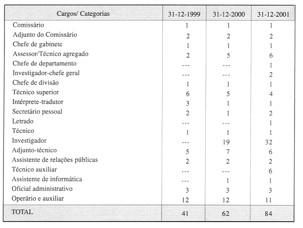 Nos termos do Regulamento Administrativo que regula "a orgânica e o funcionamento do Serviço do Comissariado contra a Corrupção", a dotação de pessoal é de 99 unidades. O número de efectivos era de 84 pessoas em 31 de Dezembro de 2001.