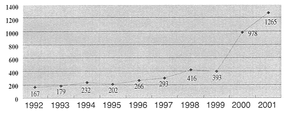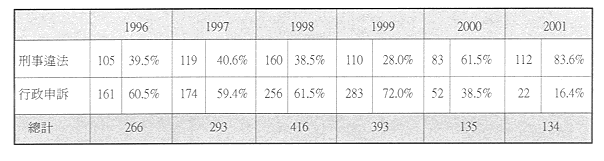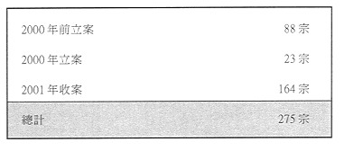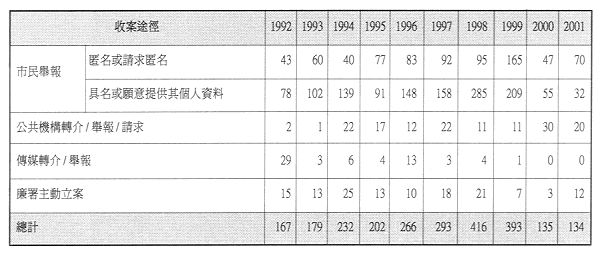 - 圖表六 1992年至2001年各年度立案數字比較(按來源界定)