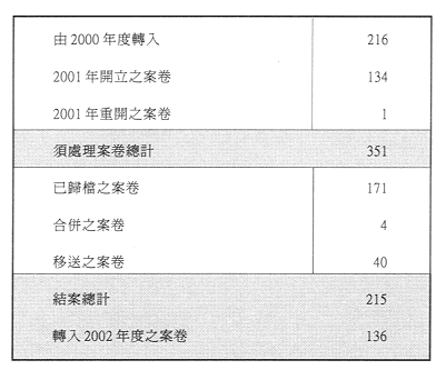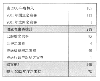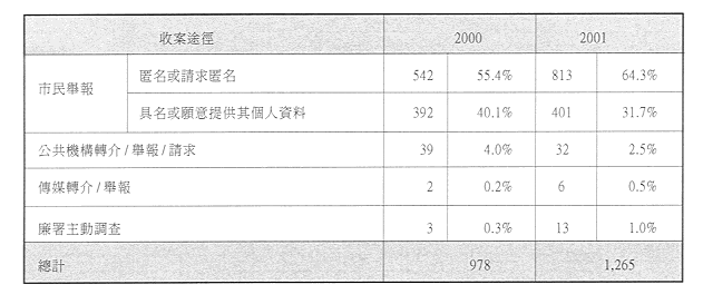 回顧2001年,廉署收案數字共計有1,265宗,較上一年度的978宗增加了近三成,是自1992年以來錄得的最高數字,其中超過九成半是來自市民的投訴或舉報,反映出市民對於肅貪倡廉的訴求日益增加,同時對廉署的信心也有所增強。