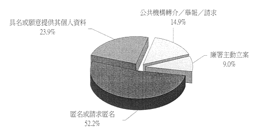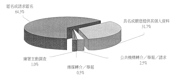 圖表二顯示,在1,265宗個案中,由市民舉報的有1,214宗,佔總數96%,匿名或請求匿名的佔64.3% (813宗),比例仍然高企,究其原因,與澳門地狹人稠,人際關係相對較為密切,導致市民對舉報依然顧慮較多有關,而這種情況多年來一直存在。不能否認匿名舉報確能為廉署反映某些情況,廉署亦不會錯過任何蛛絲馬跡,但實際上有不少舉報或投訴因資料不足而未能立案處理,即使想跟進亦有困難。對此,廉署希望能將這種情況扭轉過來,透過工作實效來爭取市民更大的信任和支持,同時鼓勵市民親身舉報,對於他們提供的一切資料,廉署絕對保密。