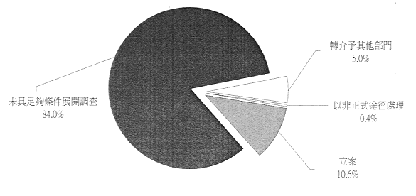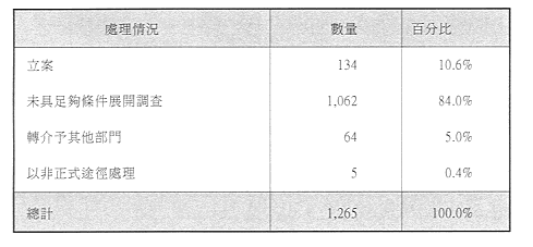 在秉承嚴謹立案的原則下,廉署於2001年內的立案數字共134宗,與2000年相若。未具備足夠條件展開調查的共計有1,062宗,有64宗被轉介到相關部門處理,此外亦有部份屬行政申訴範疇的案卷以非正式途徑進行了處理。