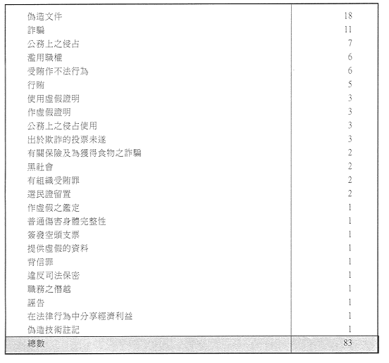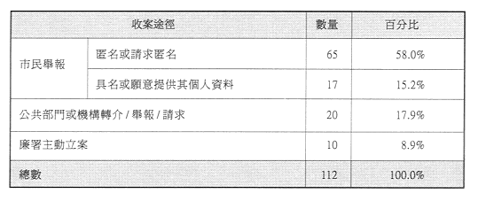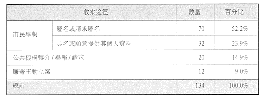 在134宗獲立案處理的案卷中,有112宗涉及刑事違法,另外的22宗屬行政申訴範疇。廉署連續第二年錄得刑事違法立案數字多於行政申訴,這與行政申訴方面主要採取非正式介入及轉介的方式處理個案,以及時、快捷、有效地解決問題有很大關係。另一方面,近兩年多以來,廉署對市民有關貪污舞弊的舉報作出迅速回應,並成功偵破多宗涉嫌貪污舞弊的案件,使市民增強了對廉署工作的信心,加上傳媒大力協助倡導廉潔文化和廣泛宣傳貪污的禍害,都鼓勵了市民勇於舉報貪污犯罪行為,故刑事違法方面的立案數字亦隨之增加。
