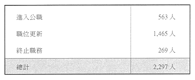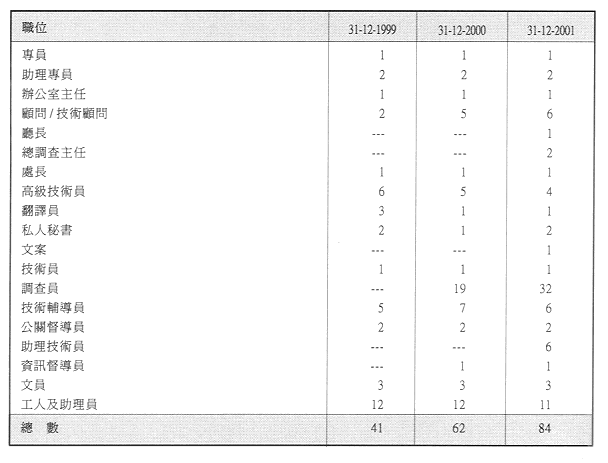 根據《廉政公署部門的組織及運作》制度,廉署的人員總數為99人。截至2001年12月31日,廉署的人員總數為84人,人員配備額仍未全部填滿。