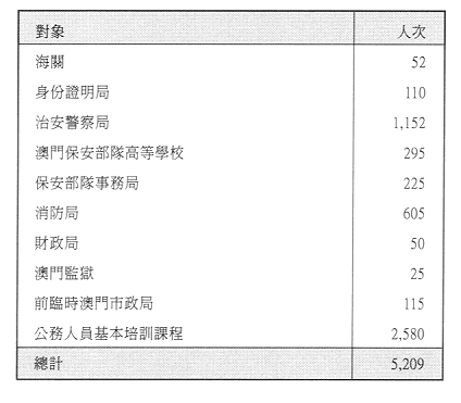 為提高整體公務員隊伍的素質,行政暨公職局開辦了『公務人員基本培訓課程』。廉署協助在其中開設一門以“廉潔精神”為內容的課程,首期培訓對象為工人及助理員。由7月至12月,廉署派員為2,580名工人及助理員講授廉政知識,首期計劃至2002年4月結束。