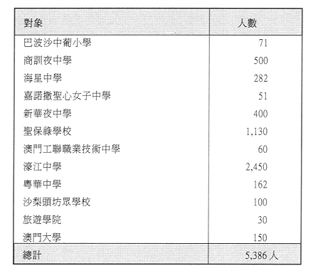 青少年學生是社會未來棟樑,廉署十分重視對他們的宣傳教育工作。年內,廉署共為5,386名大、中、小學生舉辦了肅貪倡廉講座,與2000年的886人比較,增長了五倍。通過面對面的接觸和溝通,引導青少年樹立正確的道德價值觀。