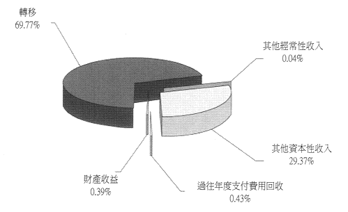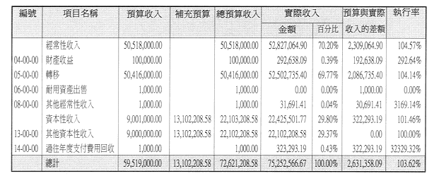 在總實際收入的MOP$75,252,566.67 (澳門幣七千五百二十五萬二千五百六十六元六角七分)中,主要收入來自『特區總預算轉移』項目,金額為MOP$52,502,735.40(澳門幣五千二百五十萬零二千七百三十五元四角),佔實際收入的69.77%。另一主要收入來源是『其他資本性收入』,金額為MOP$22,102,208.58 (澳門幣二千二百一十萬零二千二百零八元五角八分),佔實際收入的29.37%,是上年度的管理結餘。