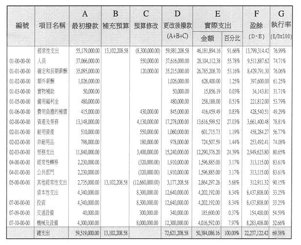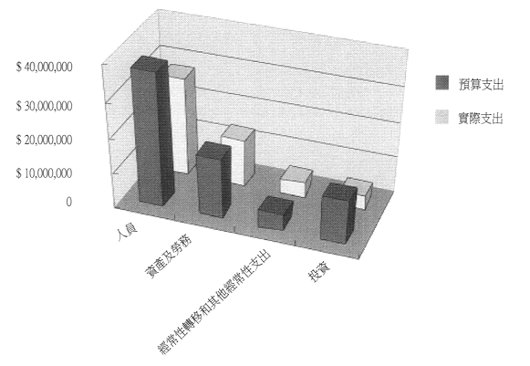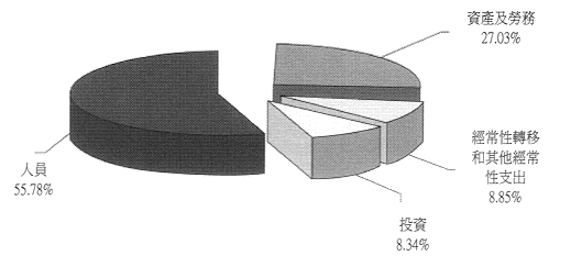在實際支出的MOP$50,384,086.16 (澳門幣五千零三十八萬四千零八十六元一角六分)中,『人員』支出佔最大部份,金額是MOP$28,104,112.38 (澳門幣二千八百一十萬零四千一百一十二元三角八分),佔55.78%,其次是『資產及勞務』,金額是MOP$13,616,599.52 (澳門幣一千三百六十一萬六千五百九十九元五角二分),佔27.03%。