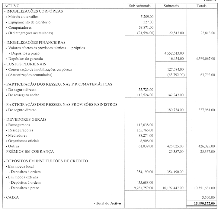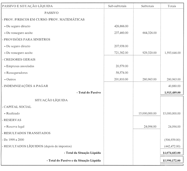 O montante de prémios brutos do exercício no ano de 2001 foi de MOP 2 808 514,00, tendo registado um decréscimo de cerca de 16% em relação ao ano de 2000. No ano a que se reporta este relatório, foi registado um prejuízo no valor de MOP 442 472,00 (o montante de prémios brutos do exercício de 2000 foi de MOP 3 341 498,00, enquanto que o lucro líquido foi de MOP 120 468,00).