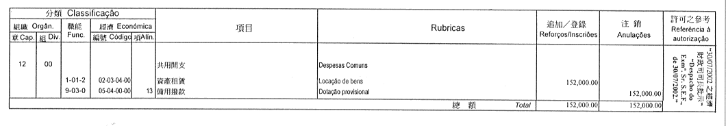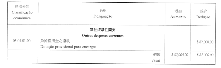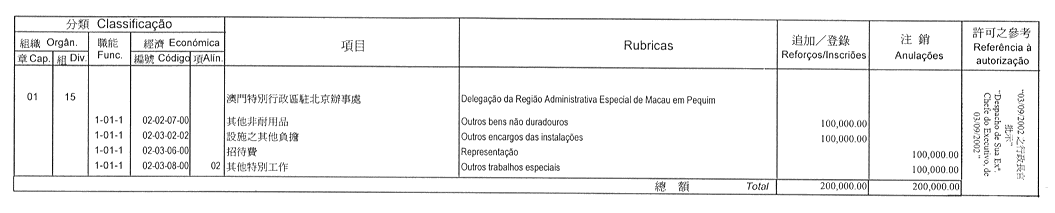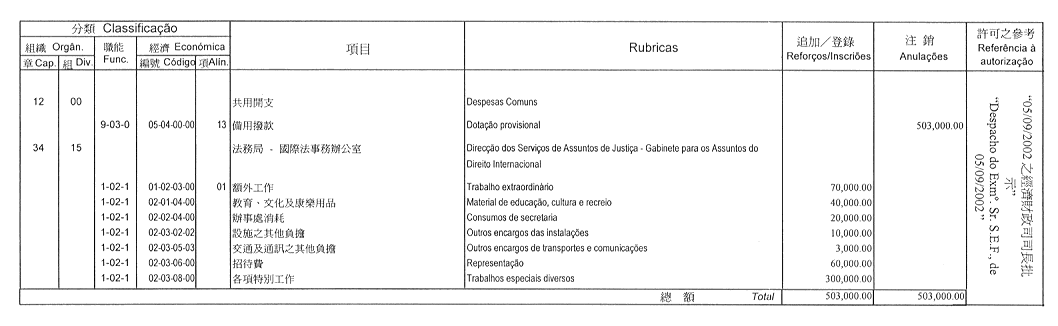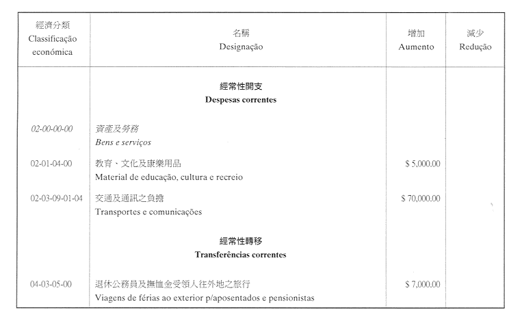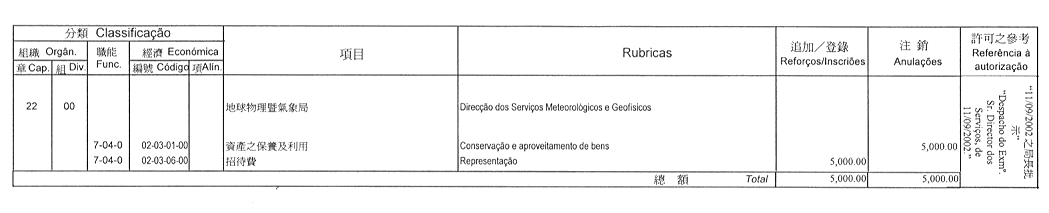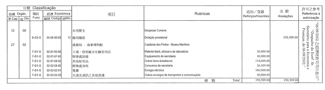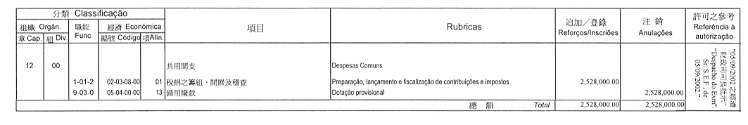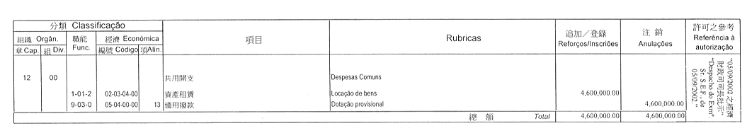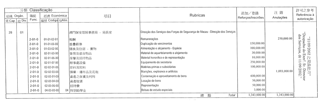 根據九月二十七日第53/93/M號法令第十九條規定,茲公佈行政法務司司長於二零零二年八月十三日批示所批准之澳門公共行政福利基金二零零二年財政年度本身預算第一次修改: