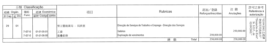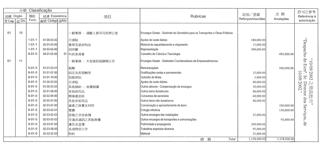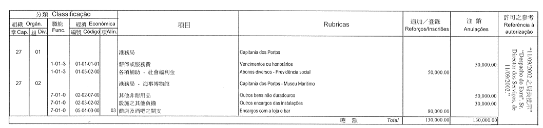 根據四月三十日第17/GM/87號批示,茲公布下列(澳門特別行政區財政預算/二零零二)款項轉帳,該轉帳由經四月二十七日第22/87/M號法令第一條修訂的十一月二十一日第41/83/M號法令第二十一條第三項規定所核准: