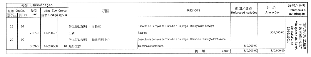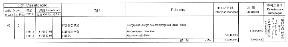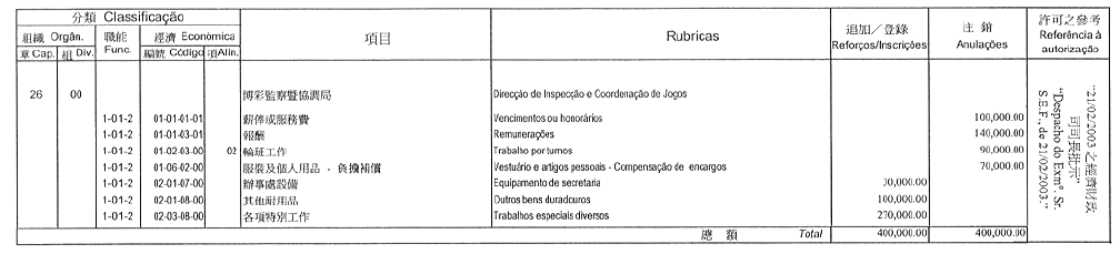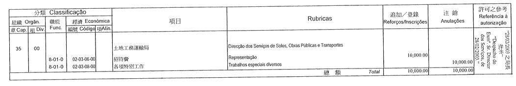根據九月二十七日第53/93/M號法令第十九條的規定,公佈經由社會文化司司長於二零零三年三月三日批准之旅遊學院二零零三年度本身預算之第一次修改: